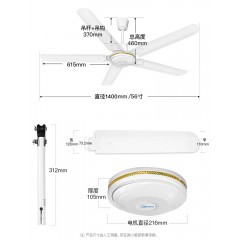 美的五叶吊扇工业大风力56寸家用静音铁叶客厅餐厅三叶吊式电风扇