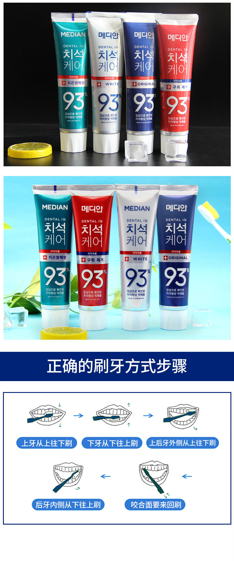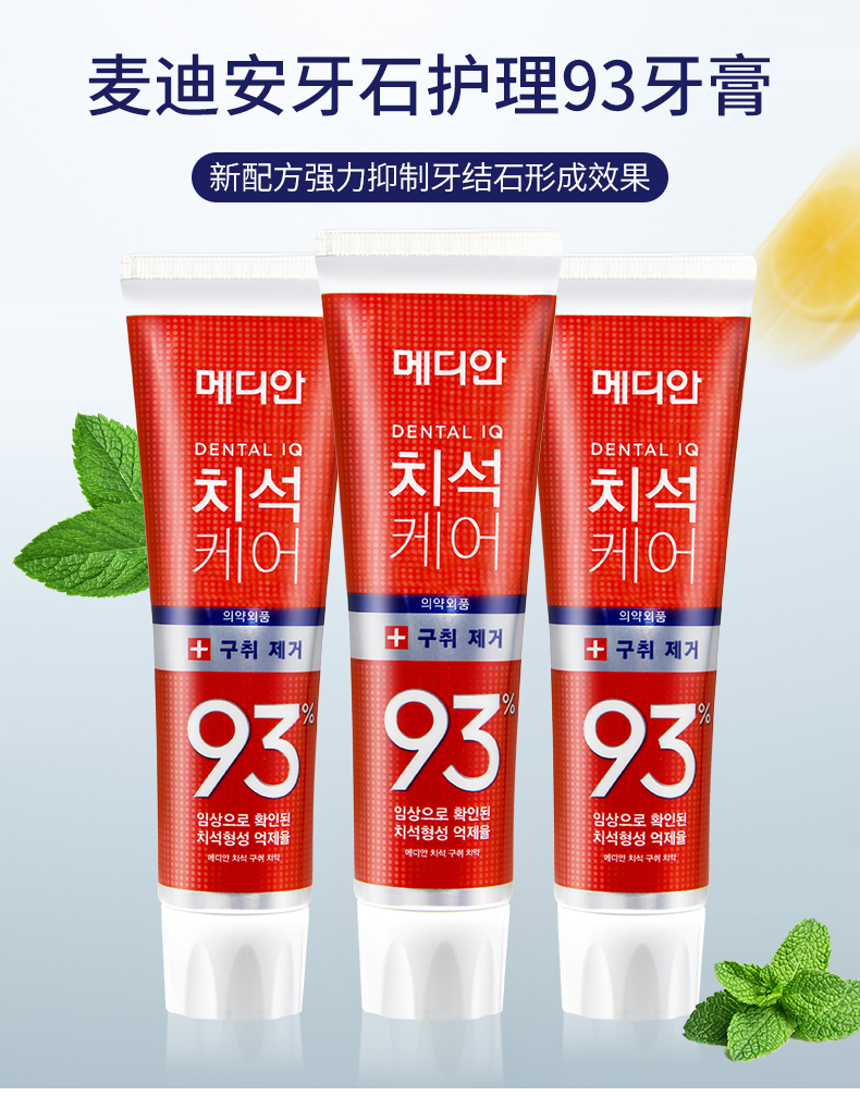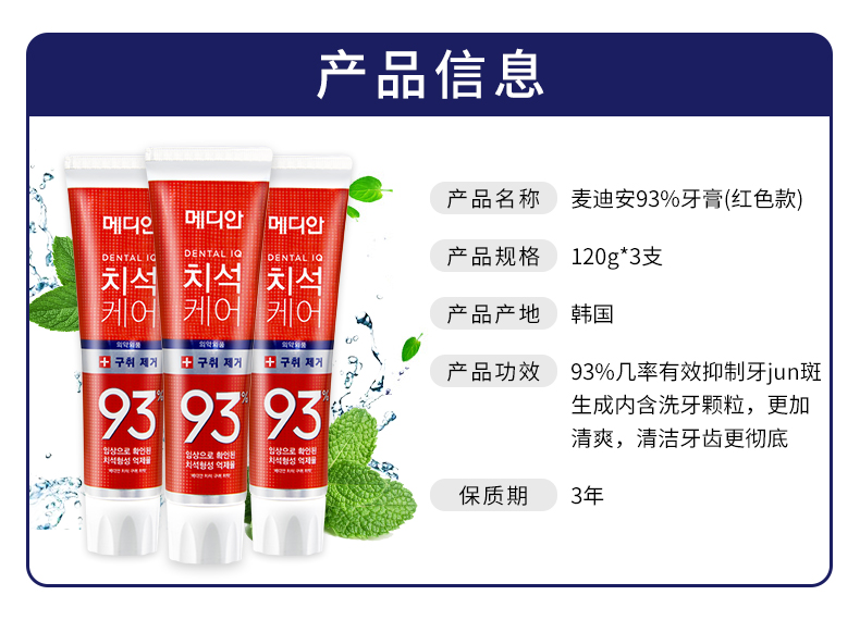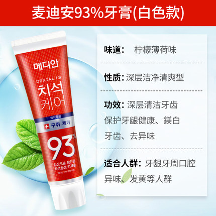 商品名称:3只装 韩国麦迪安MEDIAN 93%牙膏 美白固齿 去烟渍护龈清新 红色120g
