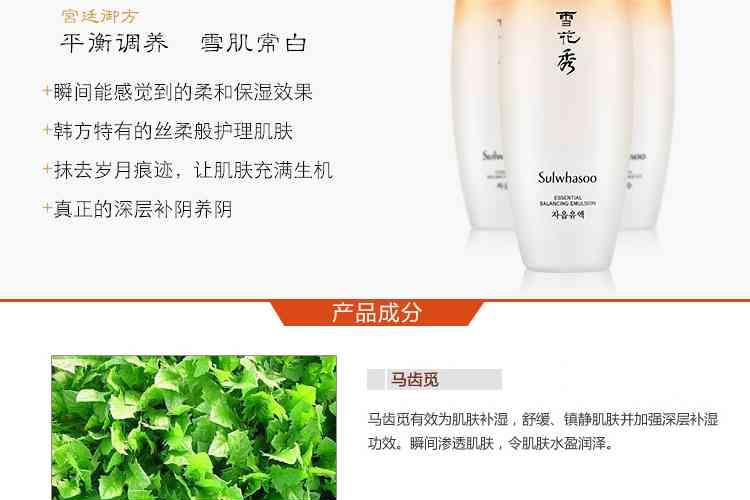 令肌肤如丝般柔滑细腻的草本营养乳液。雪花秀滋阴蕴含滋阴丹,滋阴补卫丹,马齿苋提取物,特别适合干燥肌肤使用清新柔和的乳液,涂抹肌肤后能迅速被吸收。肌肤提供丰富的营养和滋润成分,缔造四般柔滑的极富质感。韩方草本乳液,丰润质地能够改善肤质,软化肌肤。滋阴水和滋阴乳液是雪花秀滋阴的基础调护产品,其中滋阴乳液蕴含丰富韩方中药美容成分,比一般乳液更能滋养您的肌肤