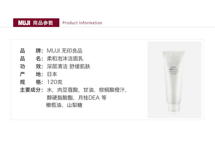 商品名称:日本无印良品柔和洁面泡沫洗面奶 120g/支 三只装