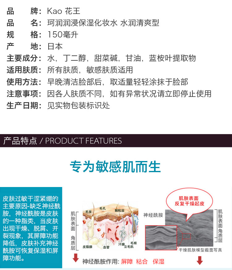 商品名称:日本花王(Kao) 珂润润浸保湿化妆水Ⅰ水润清爽型 150ml*2件