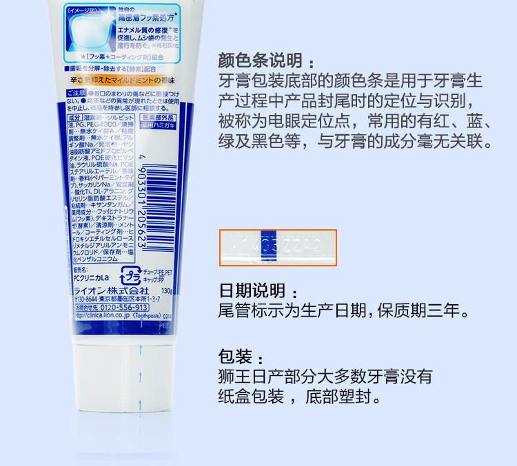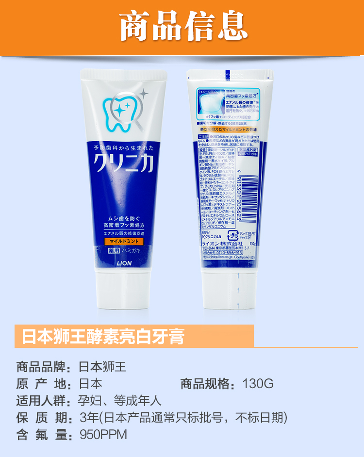 商品名称:【香港直邮】日本狮王LION酵素温和薄荷牙膏橙条130g 四支装