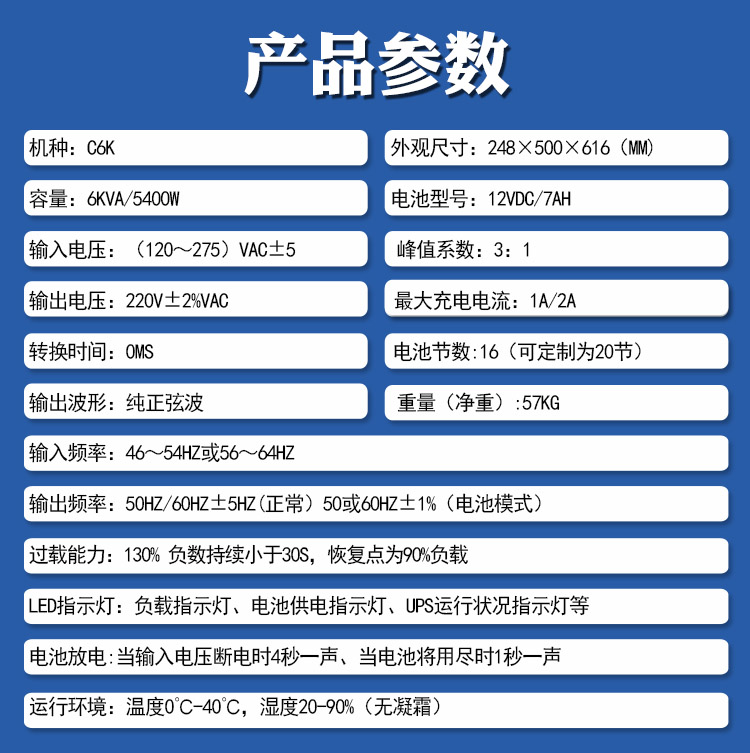 商品名称:山埔UPS不间断电源6KVA/5400W服务器停电备用应急稳压在线式C6K