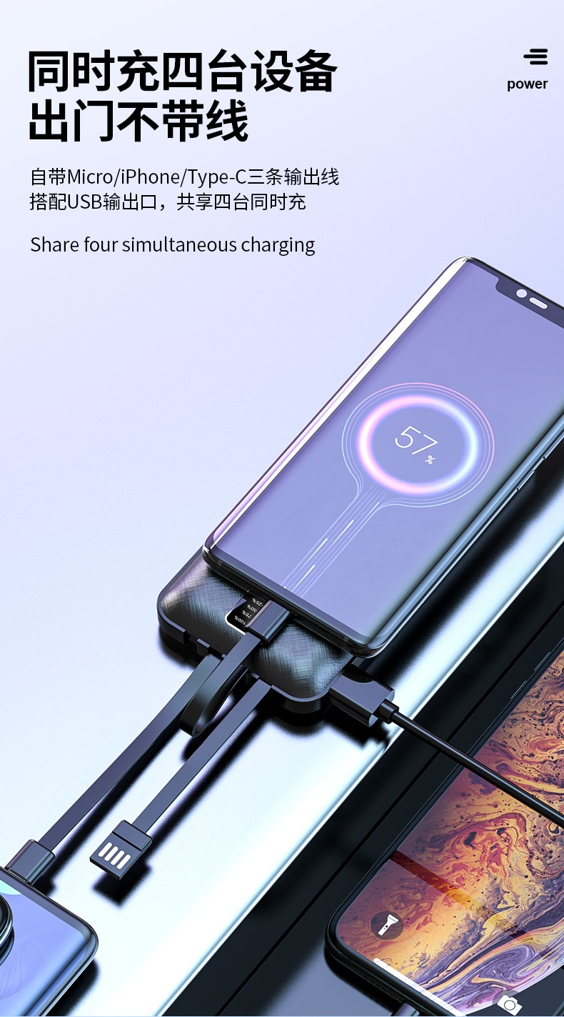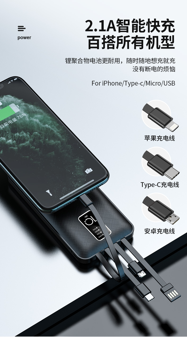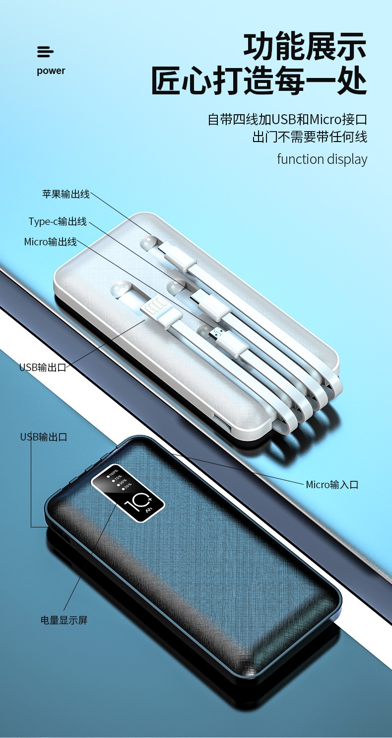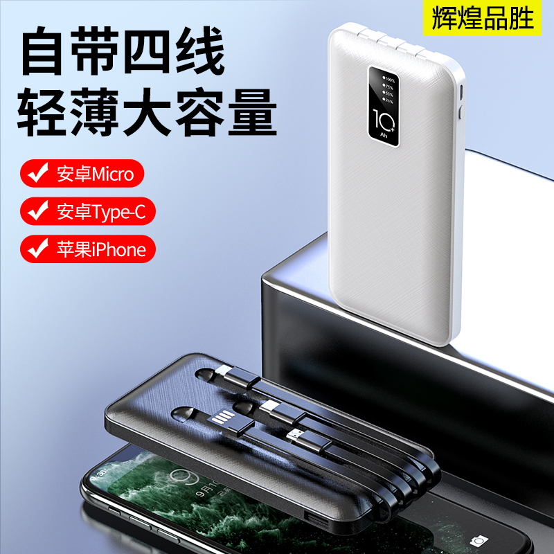 商品名称:品胜充电宝20000毫安快充超薄迷你小巧便捷大容量自带线移动电源w