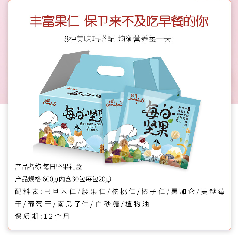 商品名称:刻凡COMEFFUN每日坚果混合8种坚果30包600g大礼包零食坚果大礼包干果 孕妇儿童的健康零食