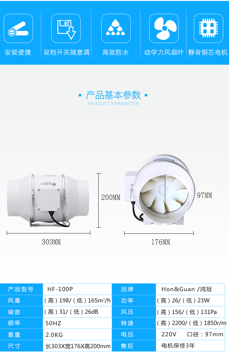 商品名称:鸿冠管道排气扇风机HF一100P静音卧室卫生间抽风机换气家用通风