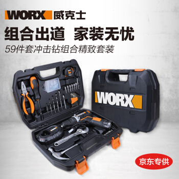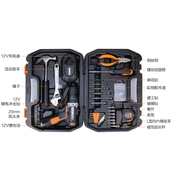 商品名称:威克士(Worx)12伏锂电钻WX129.5 冲击钻家用手电钻维修套装车载木工电工工具箱59件套电动工具