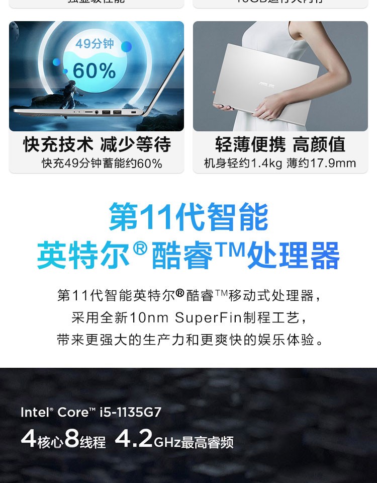 商品名称:华硕(ASUS)VivoBook14 2021 英特尔酷睿 新品14英寸IPS高清屏轻薄本笔记本电脑 冰晶银 11代i5 16G 512G 锐炬显卡
