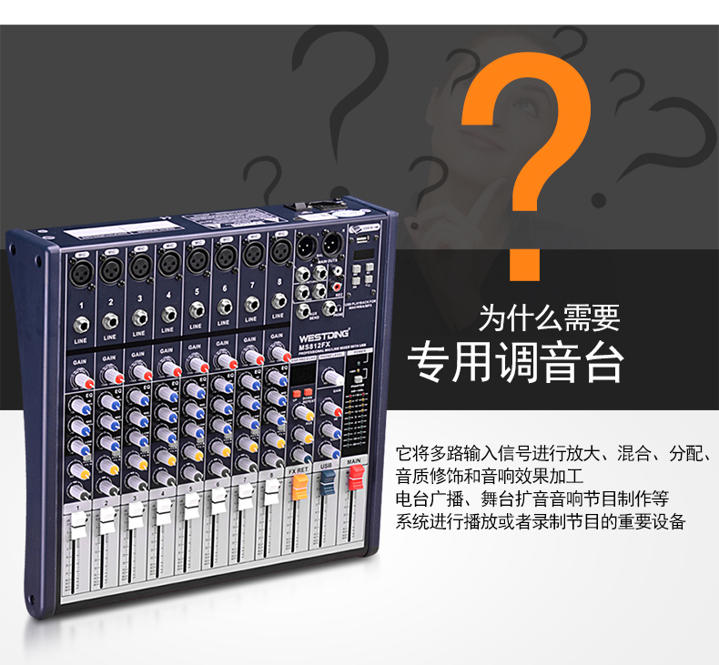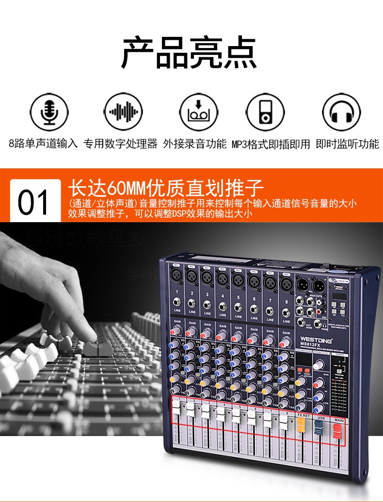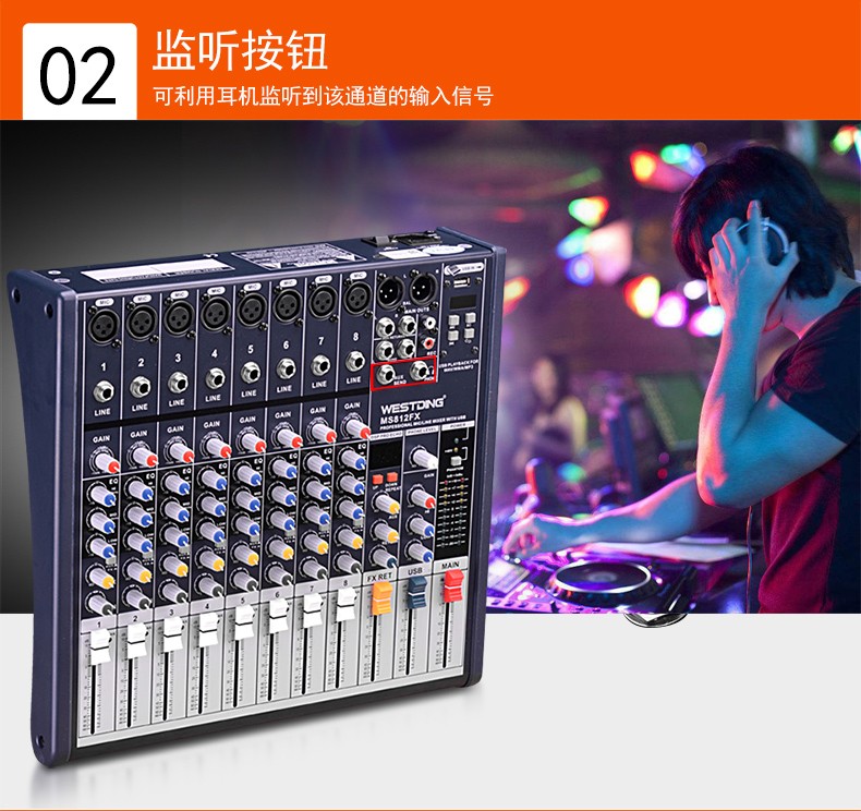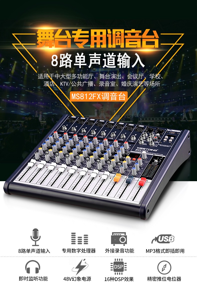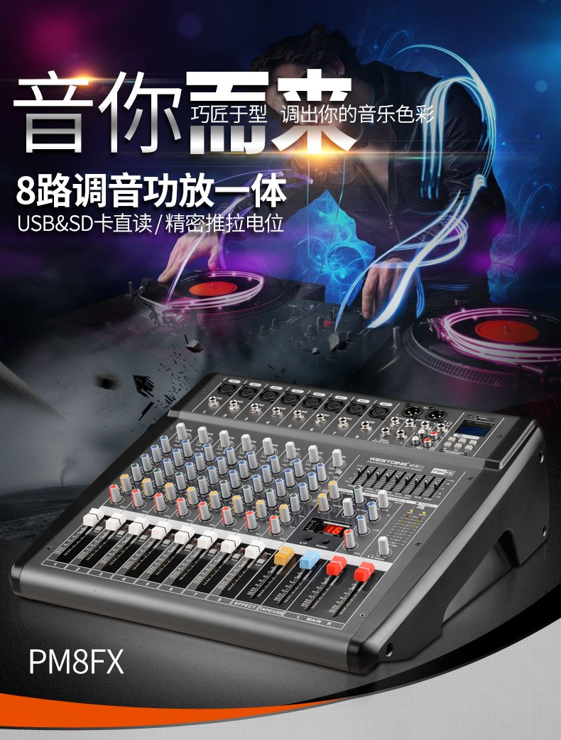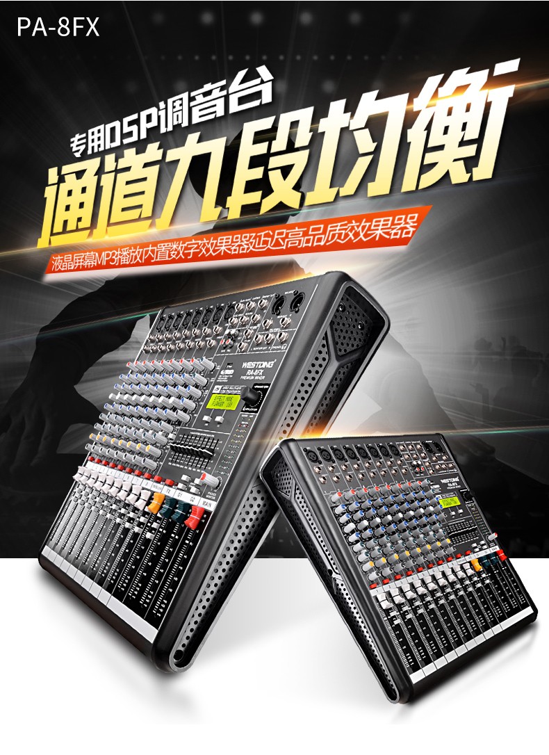 商品名称:威斯汀8FX舞台专业8路调音台ktv演出音响控音设备大功率数字音频混响调音器带功放