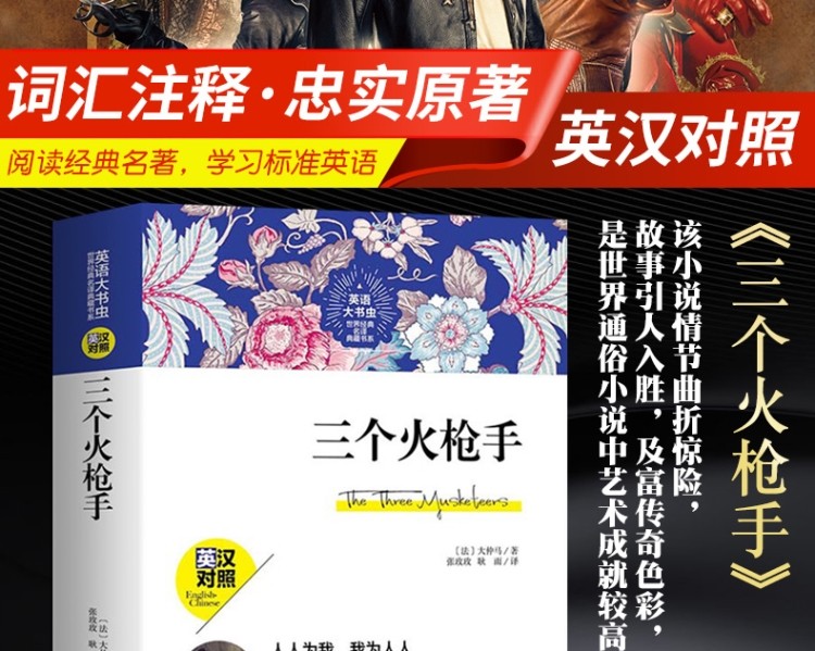 商品名称:送音频】三个火枪手双语版书籍中英对照英文版中文版英汉对照大仲马著英语学习藏书之选英文原著词汇注释正版书籍世界经典名译典藏