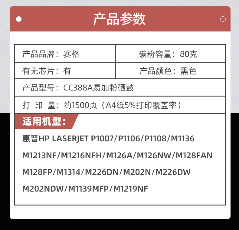 商品名称:赛格适用惠普m1136mfp硒鼓388a易加粉m126a/nw 1213nf打印机m1216nfh墨盒p1108 1007 1106晒鼓CC388A/88a硒鼓