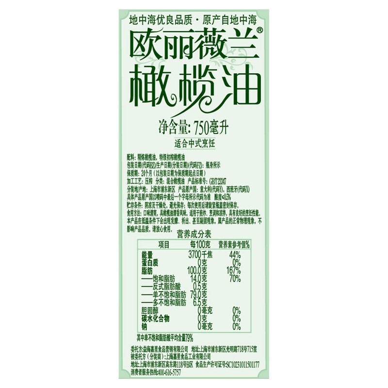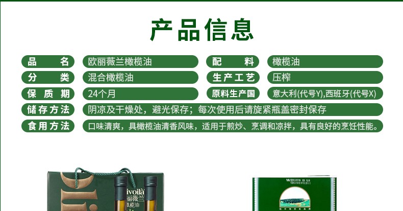 商品名称:欧丽薇兰纯正橄榄油750ml*2礼盒