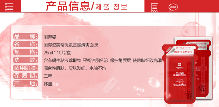 商品名称:韩国丽得姿Leaders美蒂优氨基酸清爽面膜 10片/盒 三盒装
