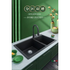 意狄讴黑色厨房石英石花岗岩水槽洗菜池洗碗槽水池大双槽台下盆