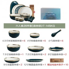 川岛屋北欧轻奢餐具套装网红金边碗盘子欧式碗筷碗碟套装家用组合(6人26件套)森林绿