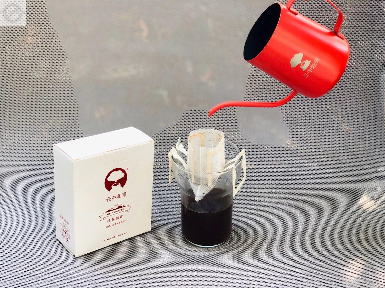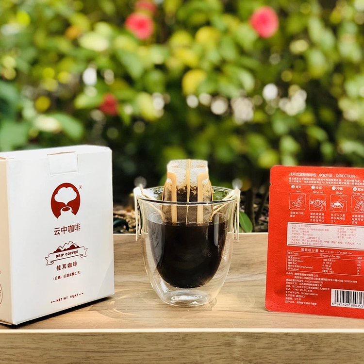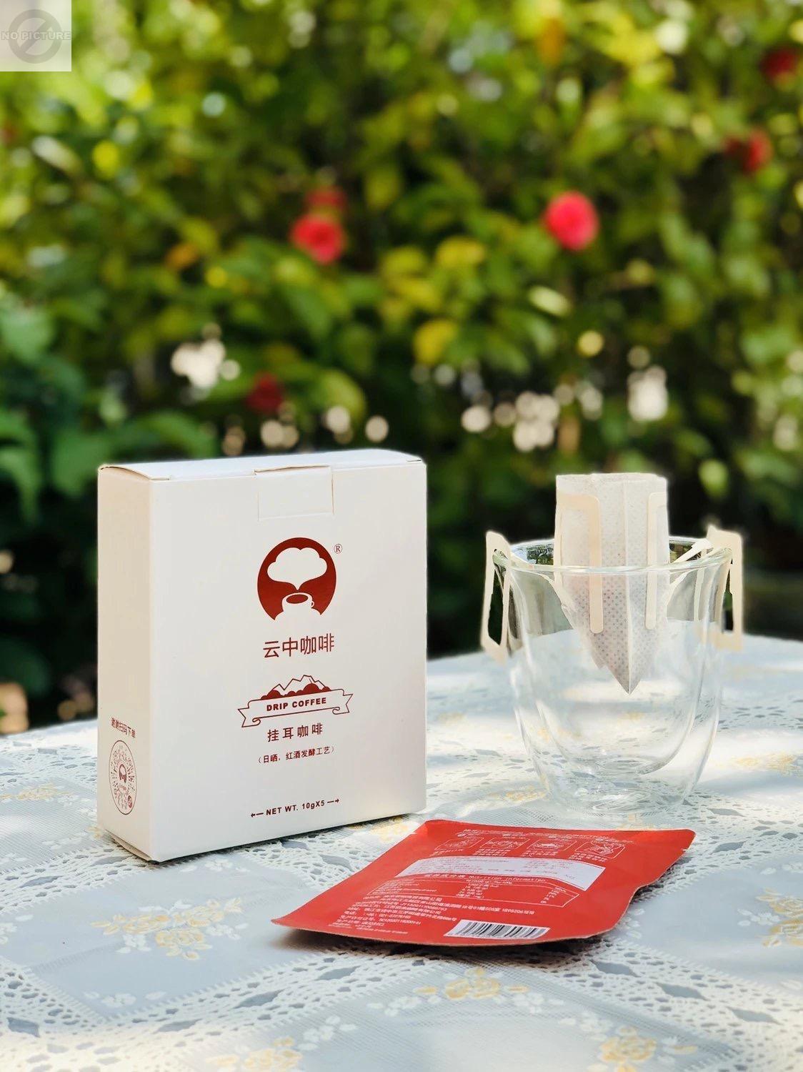 云中挂耳咖啡(日晒、红酒发酵工艺)一盒5片,每片10克,选自世界精品咖啡协会认证 80+ 云南临沧当季精品日晒豆,新鲜研磨成粉,独立包装。优质滤挂咖啡包,不散粉,不起毛,孔隙均匀,易于冲泡,口感稳定。外盒尺寸:(长11cm*宽5cm*高13cm)