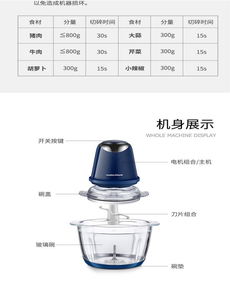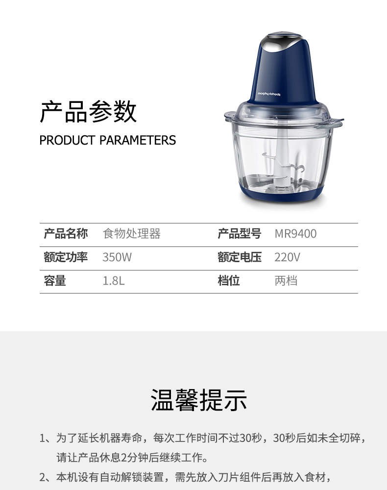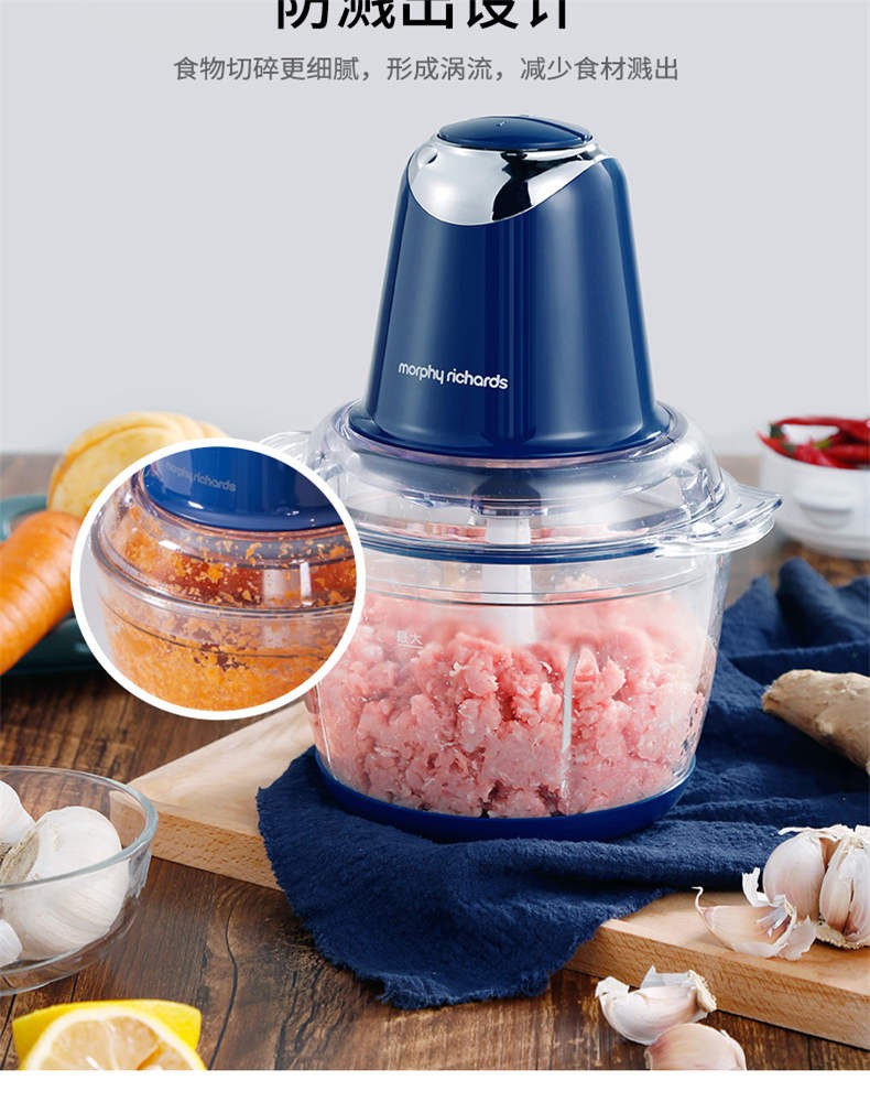商品名称:摩飞电器(MORPHYRICHARDS)绞肉机家用电动多功能辅食料理机绞馅儿机打蛋机蓝色MR9400