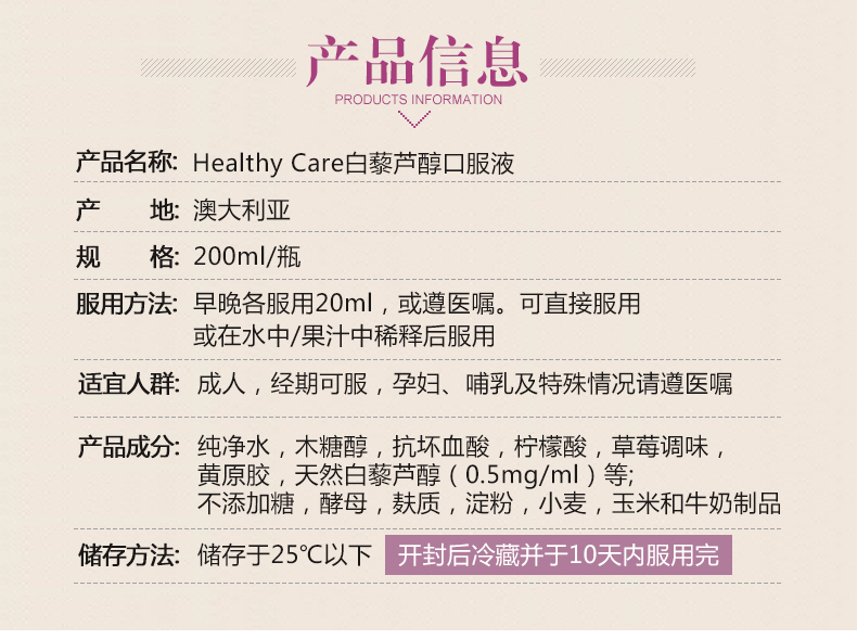 商品名称:Healthy Care白藜芦醇精华液200ml