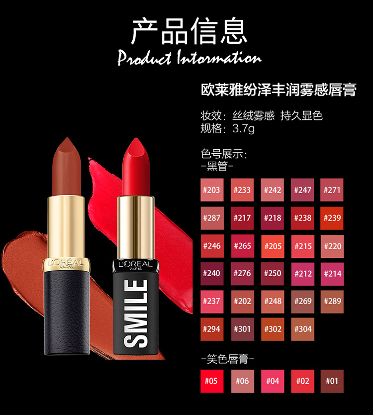 商品名称:法国巴黎欧莱雅L\\\'OREAL纷泽丰润雾感唇膏239 3.7g辣椒红(王源同款)
