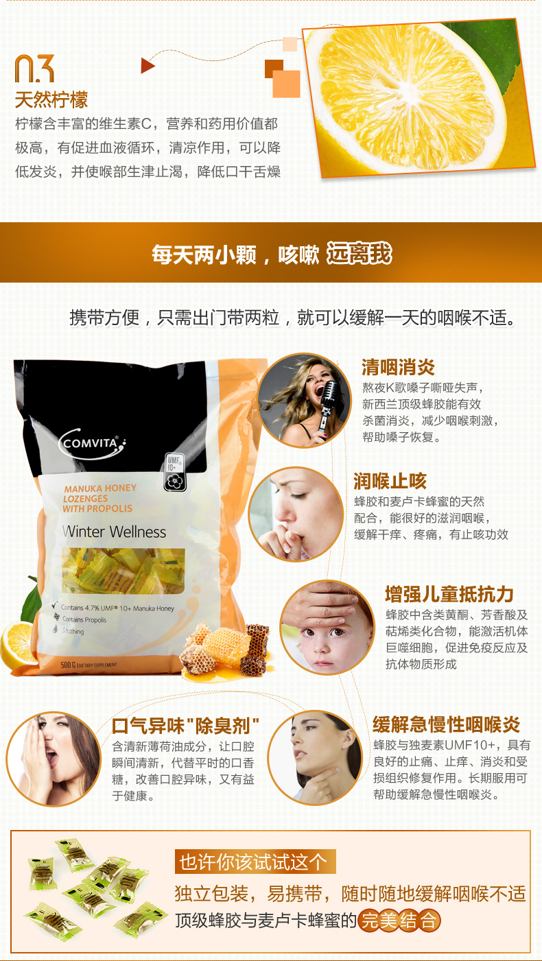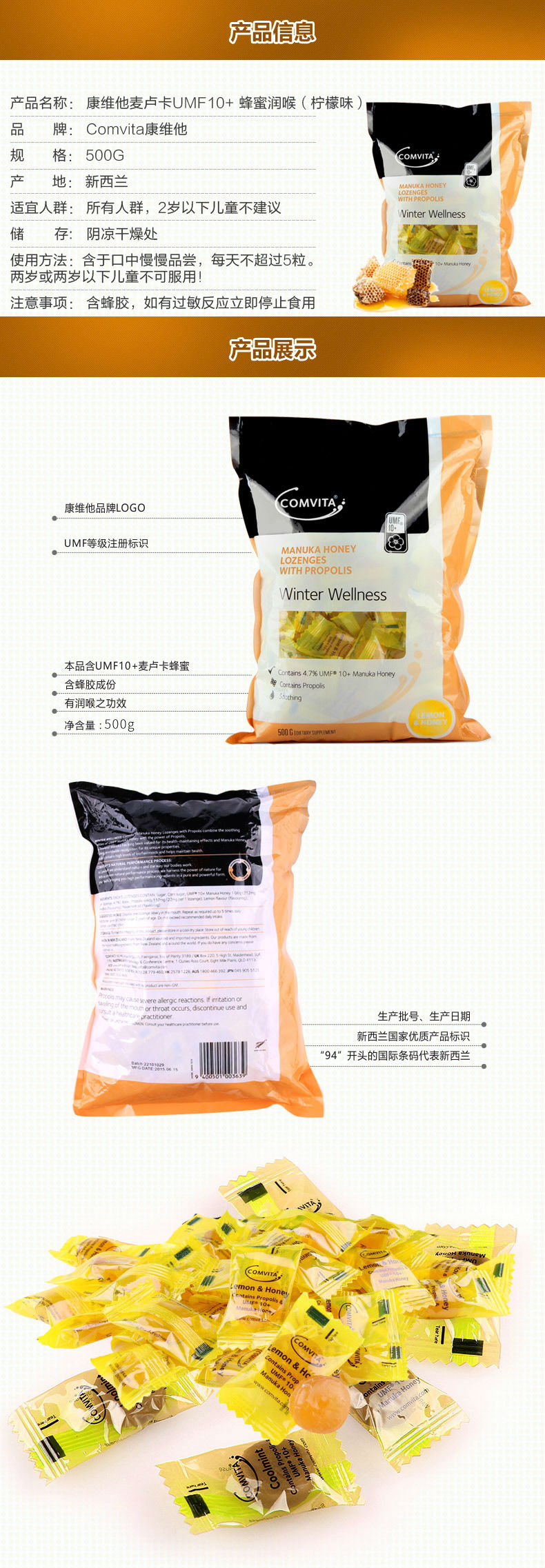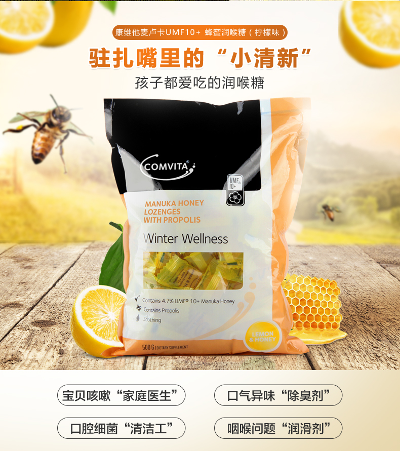 商品名称:【香港直邮】新西兰康维他comvita康维他蜂胶糖果500g柠檬味
