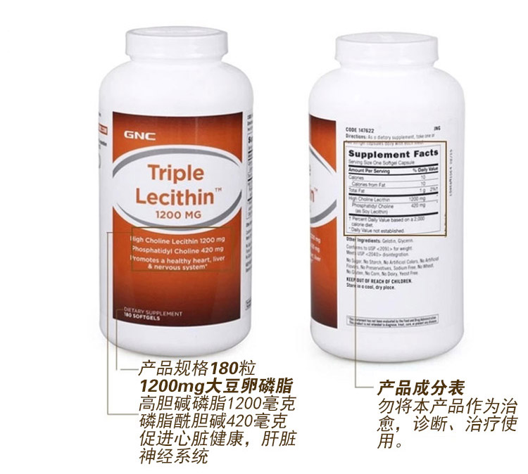 商品名称:【香港直邮】美国健安喜GNC三重大豆卵磷脂软胶囊1200mg180粒护肝降血脂胆固醇