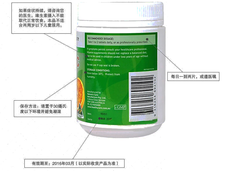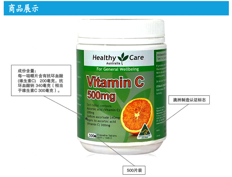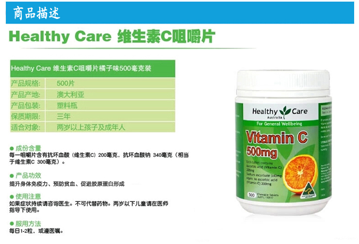 商品名称:香港直邮】澳洲Healthy Care Vitamin维生素C维他命c咀嚼片500片