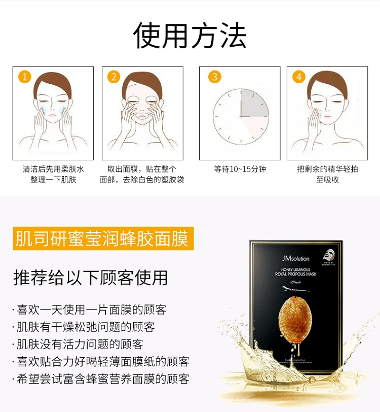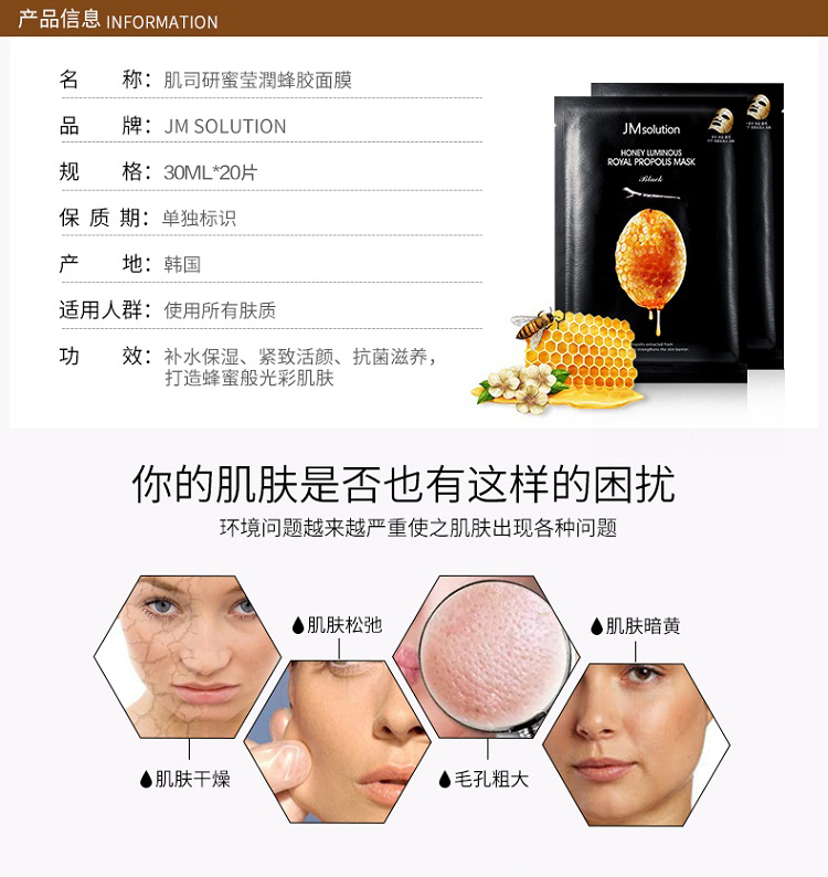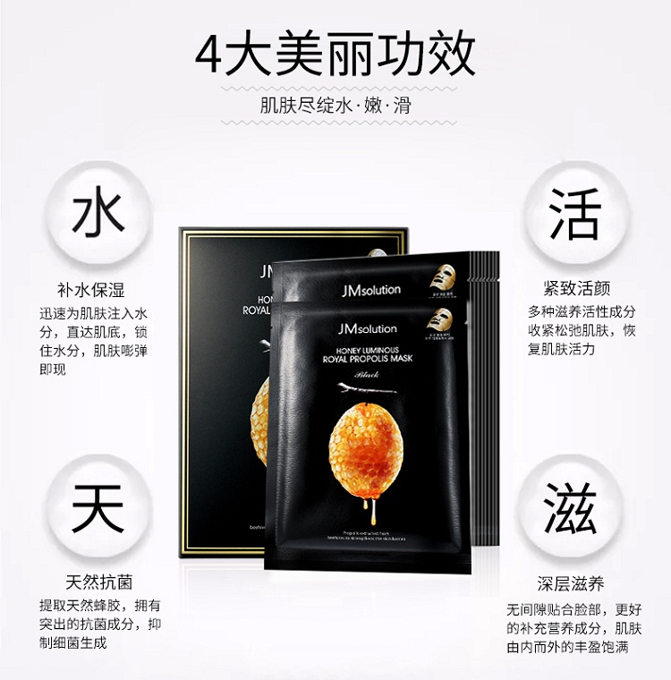 商品名称:韩国 JM Solution肌司研 Z 面膜 蜜莹潤蜂胶面膜10片*1盒
