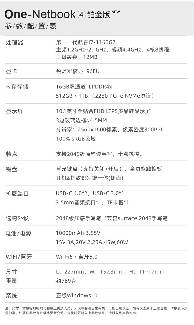 商品名称:壹号本(4代铂金版)10.1英寸全面屏英特尔11代酷睿i7掌上迷你电脑电脑商务轻薄笔记本电脑 铂金色 11代酷睿i7 16GB+1TB