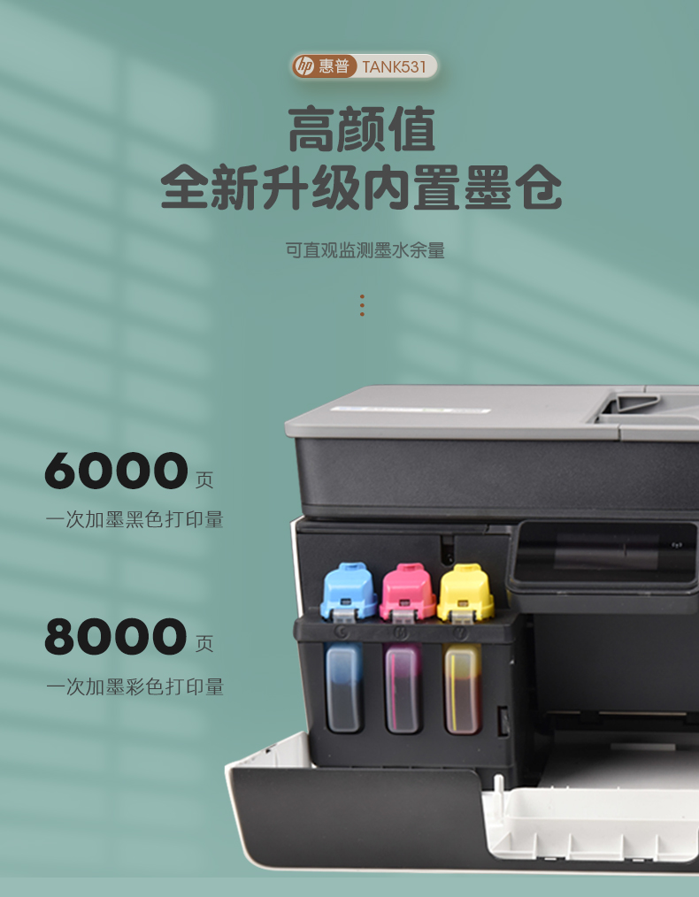 商品名称:hp惠普tank531打印机家用小型墨仓式连供复印扫描一体机学生作业a4迷你彩色照片可连手机无线喷墨办公商用519