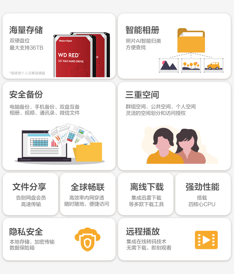 商品名称:Lenovo联想个人云T2/T2 Pro/A1 nas网络存储服务器主机箱局域网数据共享家用家庭私有云储存双盘位西数硬盘