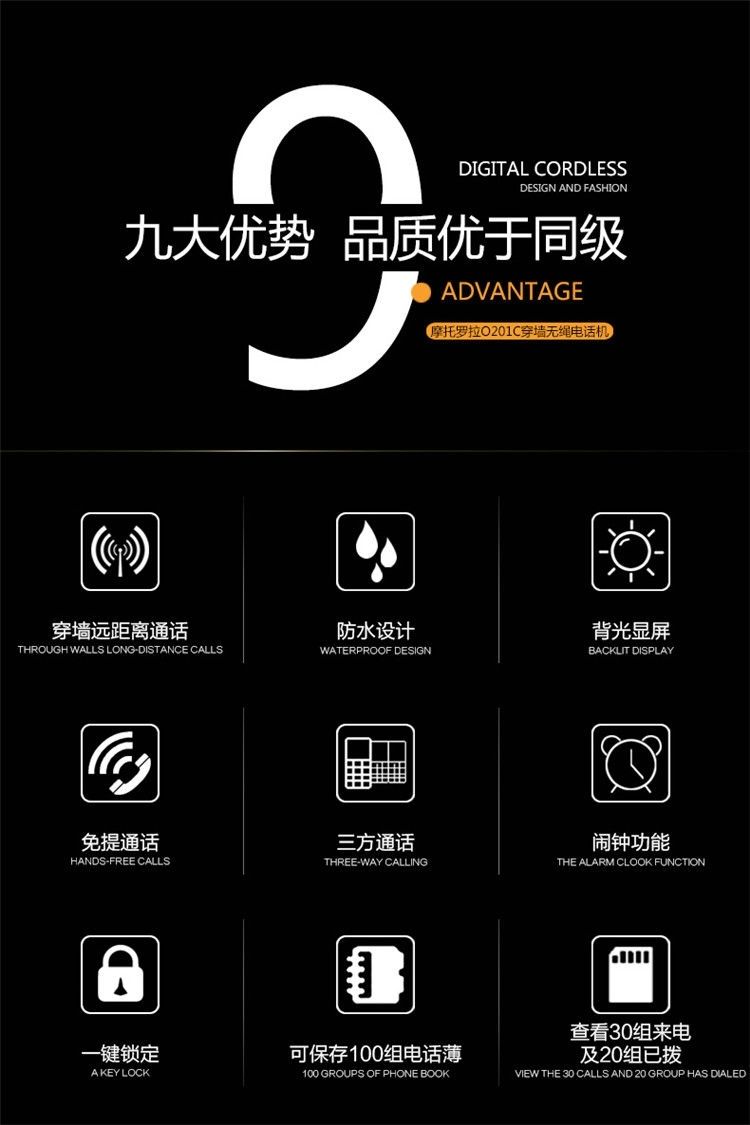 商品名称:摩托罗拉O201C远距离数字无绳电话机子母机分体挂墙别墅房复式房