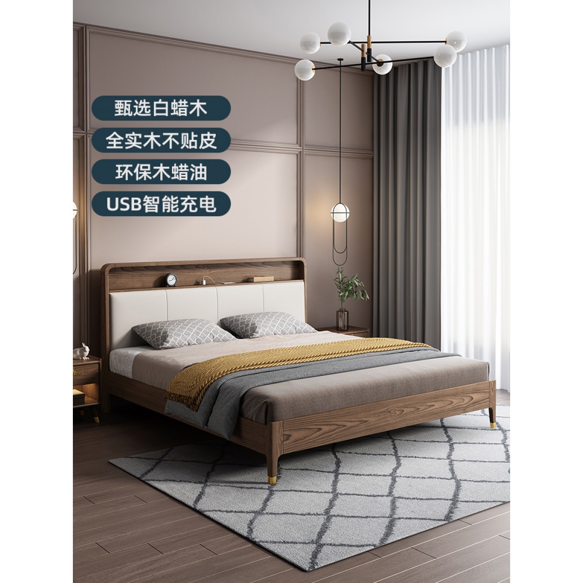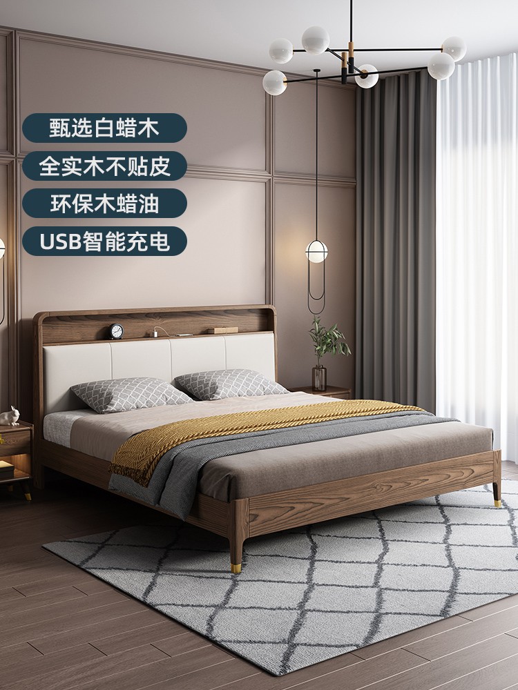 百纯实木床白蜡木1.8米双人床现代简约主卧床小户型软包轻奢婚床