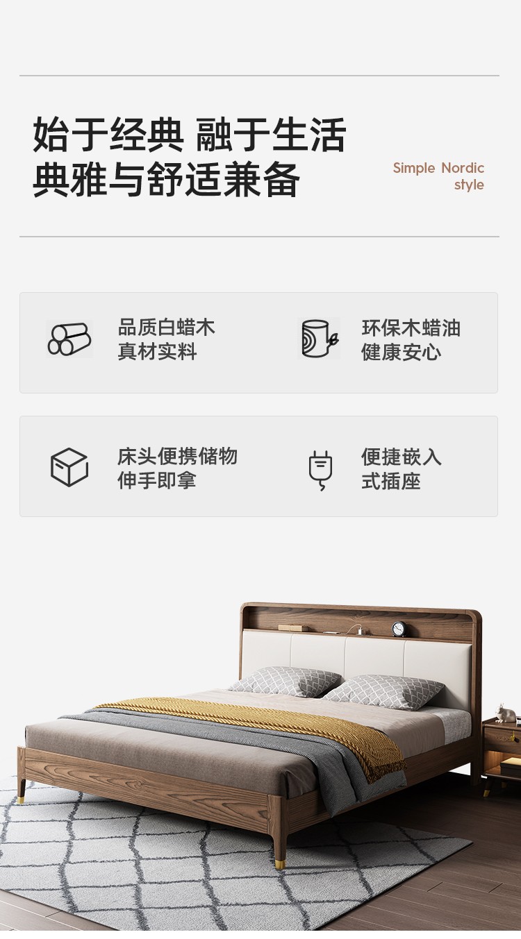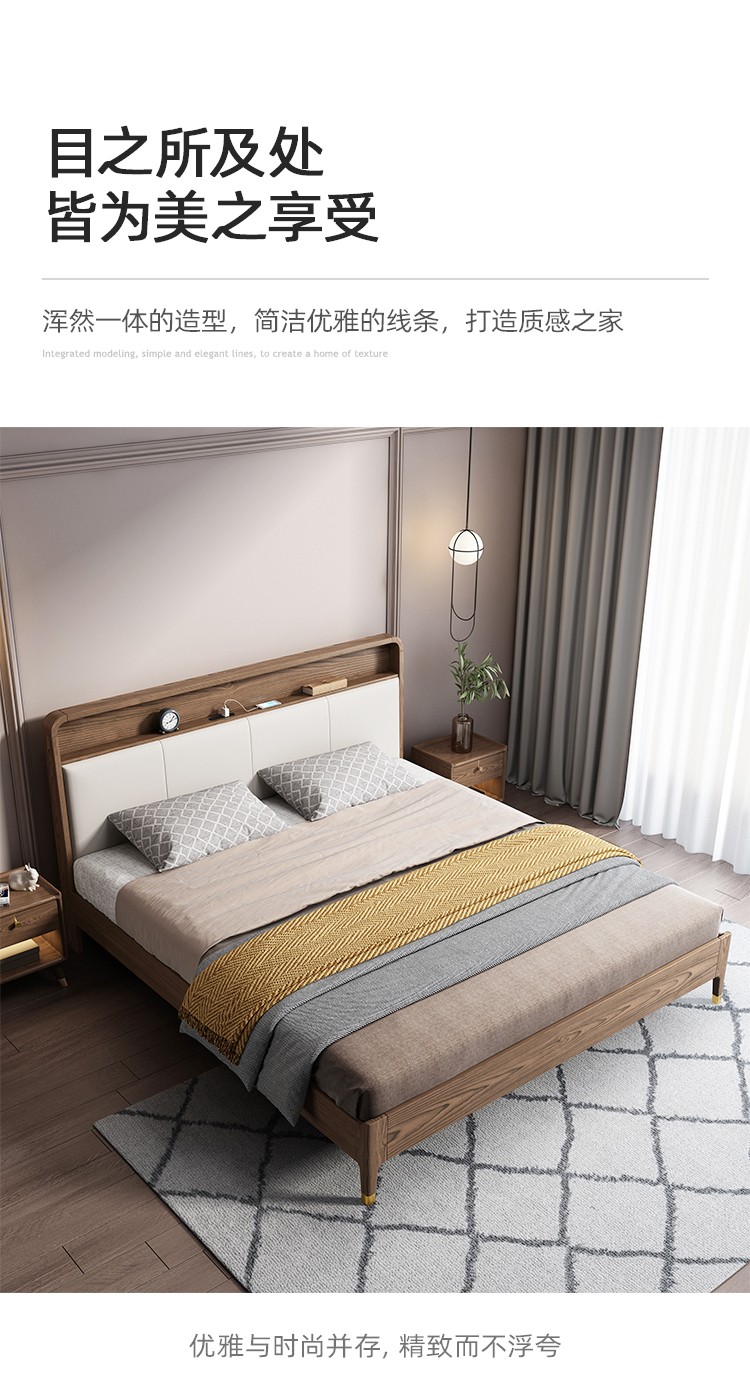 商品名称:百纯实木床白蜡木1.8米双人床现代简约主卧床小户型软包轻奢婚床