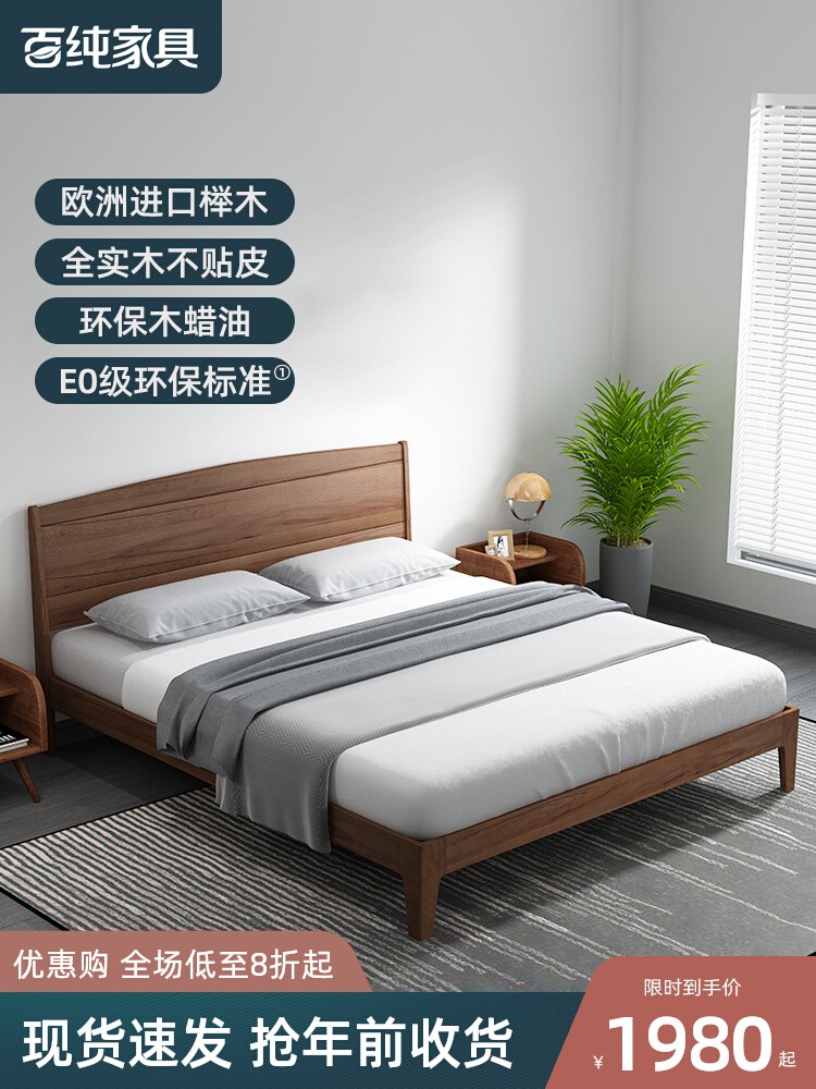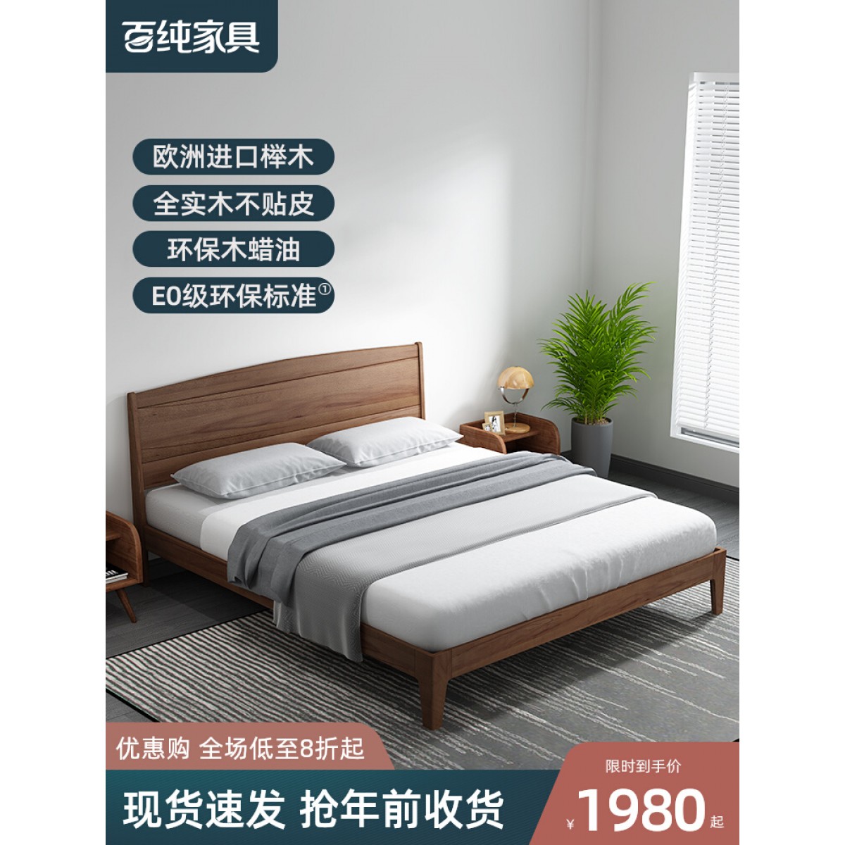百纯家具全实木床卧室1.8米榉木床北欧床现代简约1.5主卧双人床QC