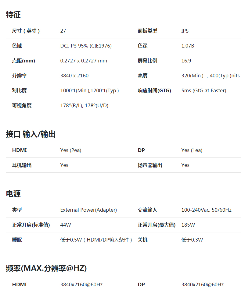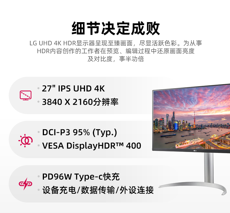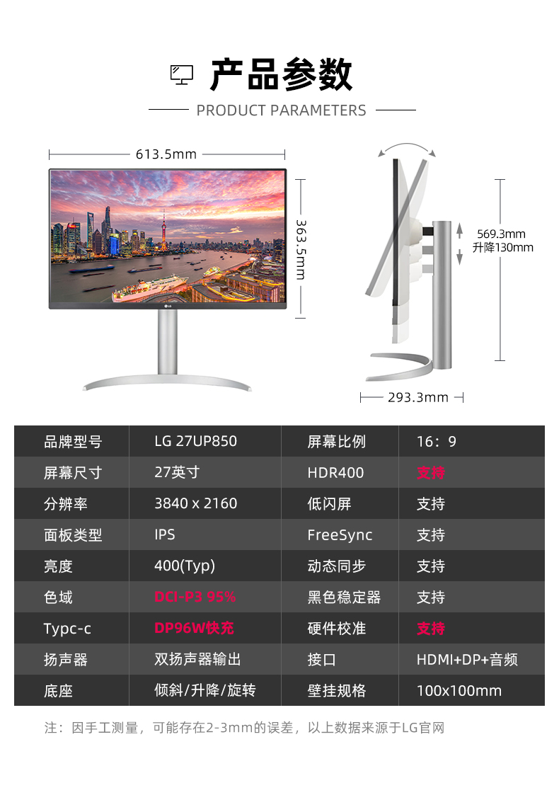 商品名称:LG 27英寸4K IPS显示器27UP850摄影后期设计绘图HDR400硬件校色10bit视网膜屏27UL850