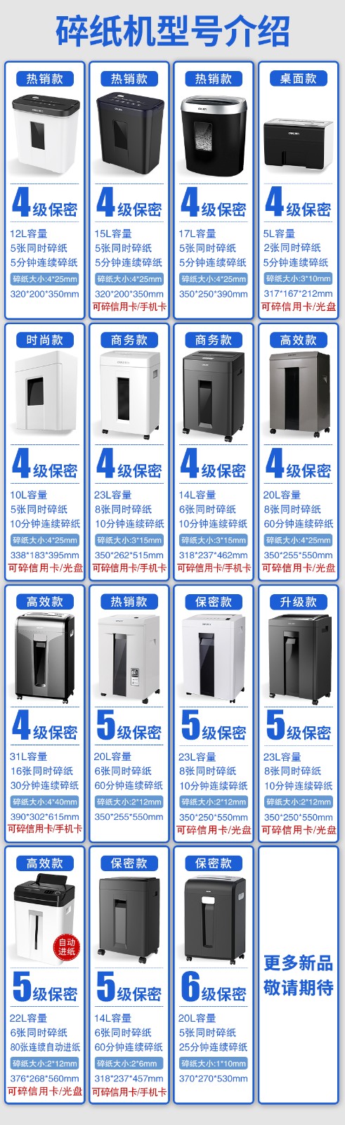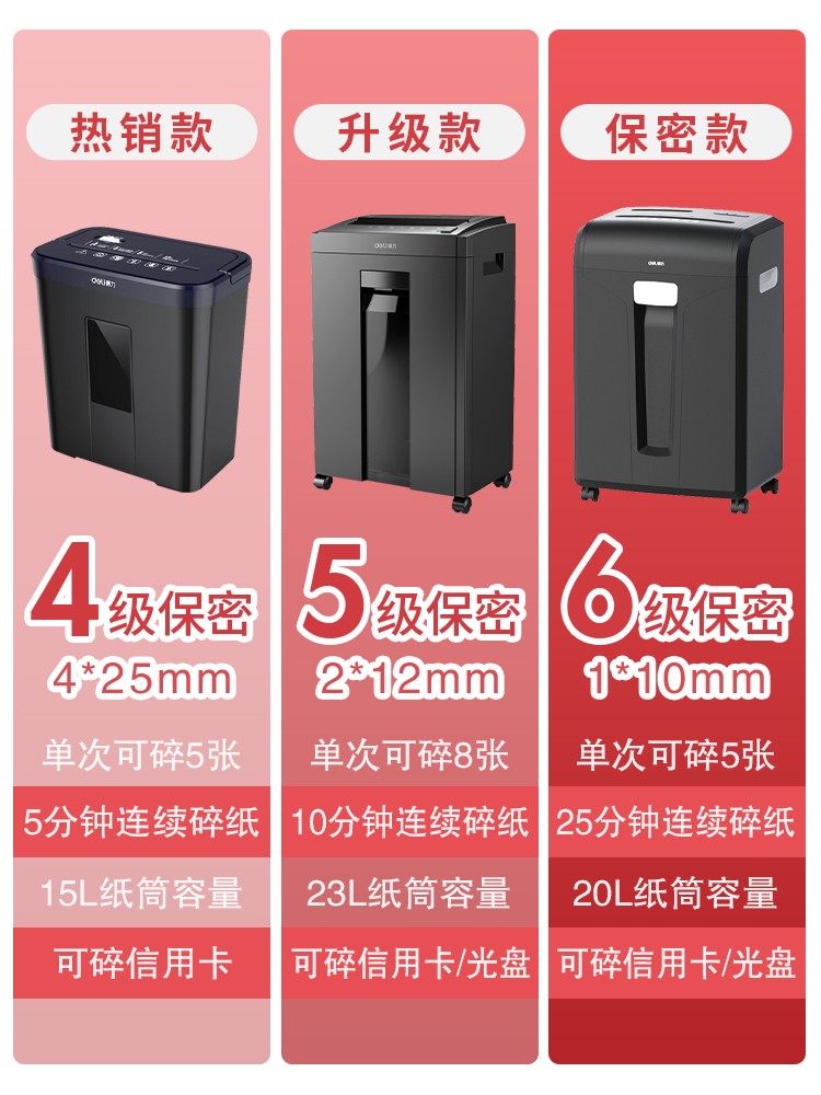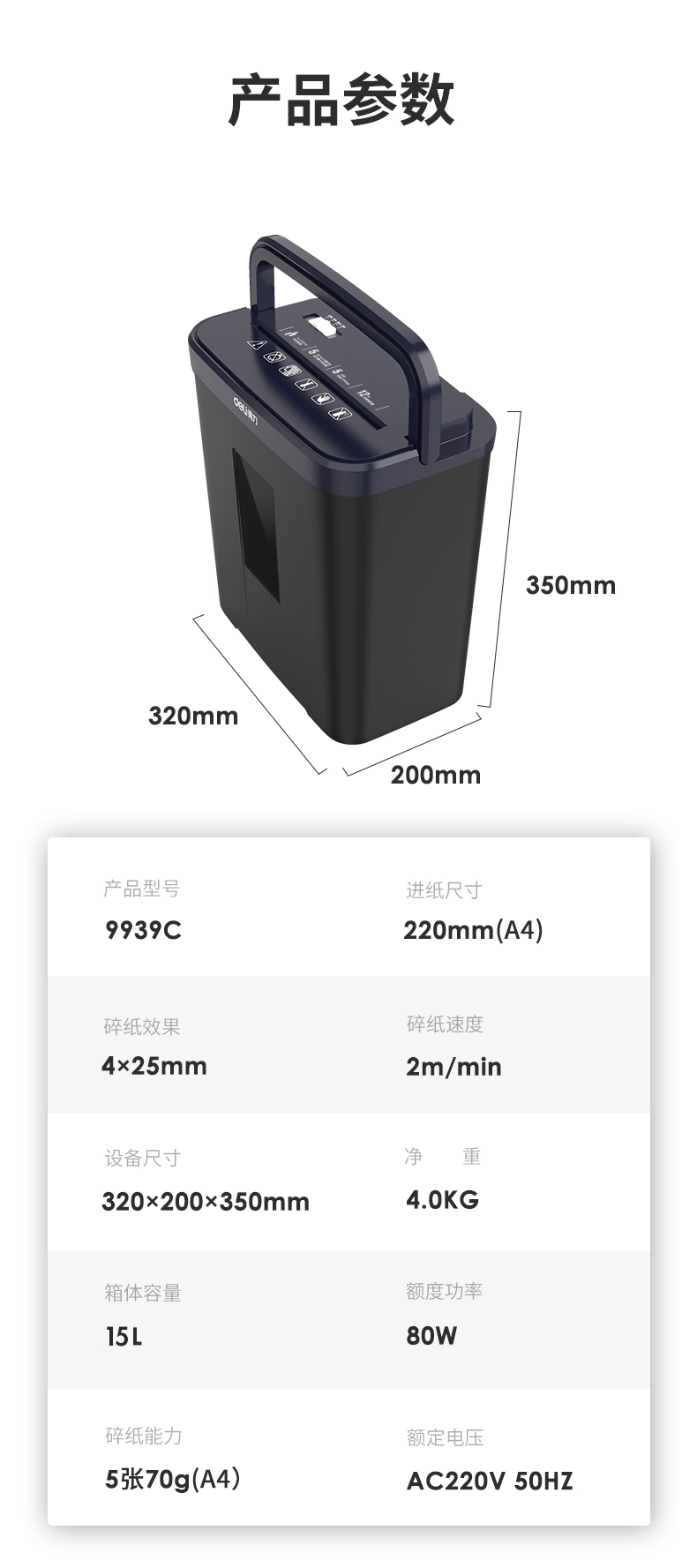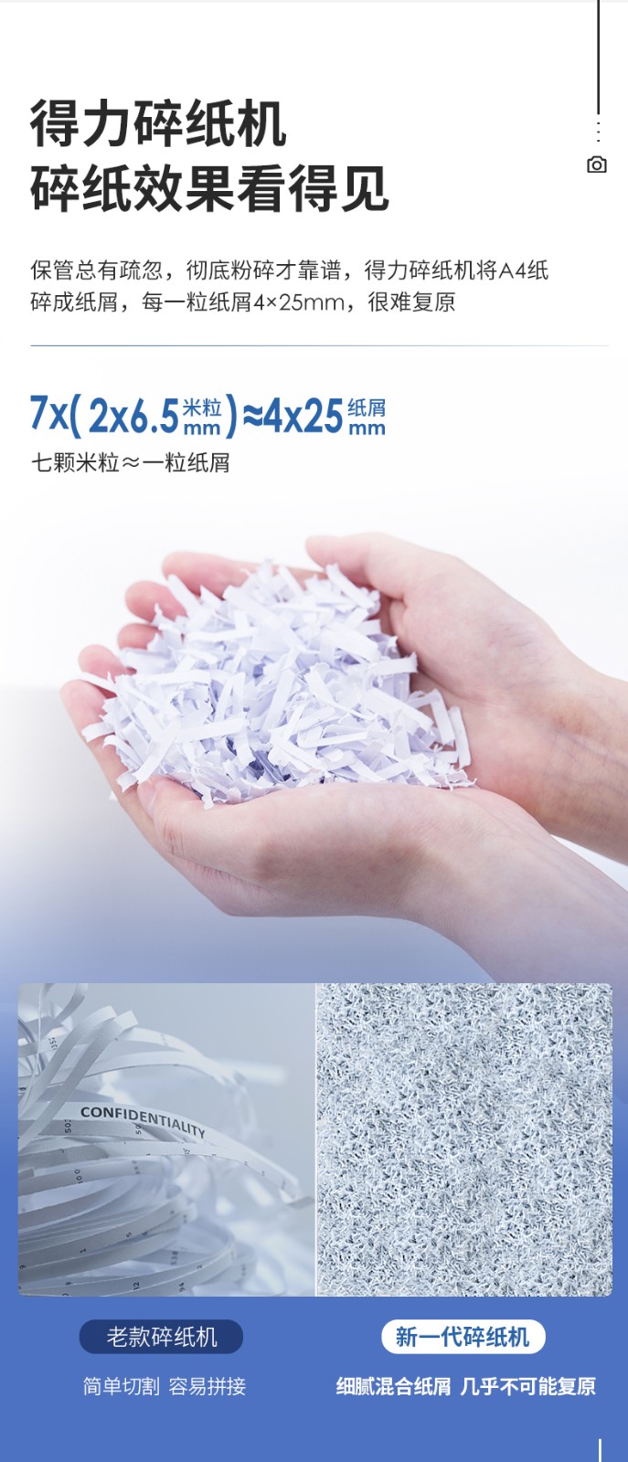 商品名称:得力9939C碎纸机办公室专用自动小型家用颗粒状电动大功率商用便捷桌面纸张文件迷你粉碎机5级保密神器碾碎机
