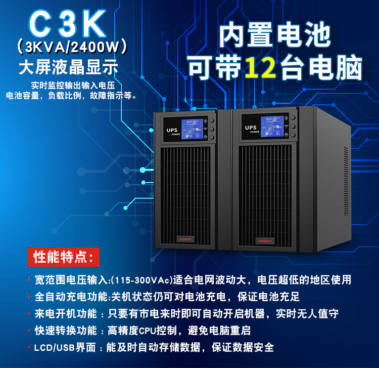 山埔UPS不间断电源在线式3KVA/2400w电脑备用稳压220v停电应急C3K
