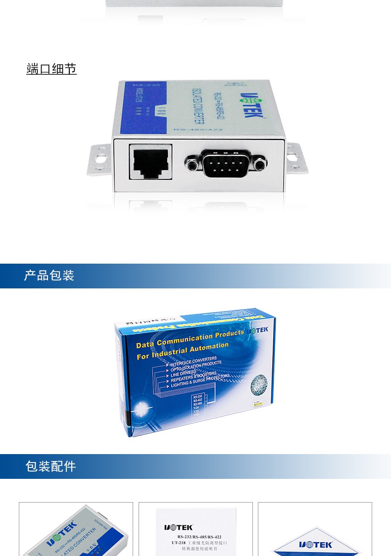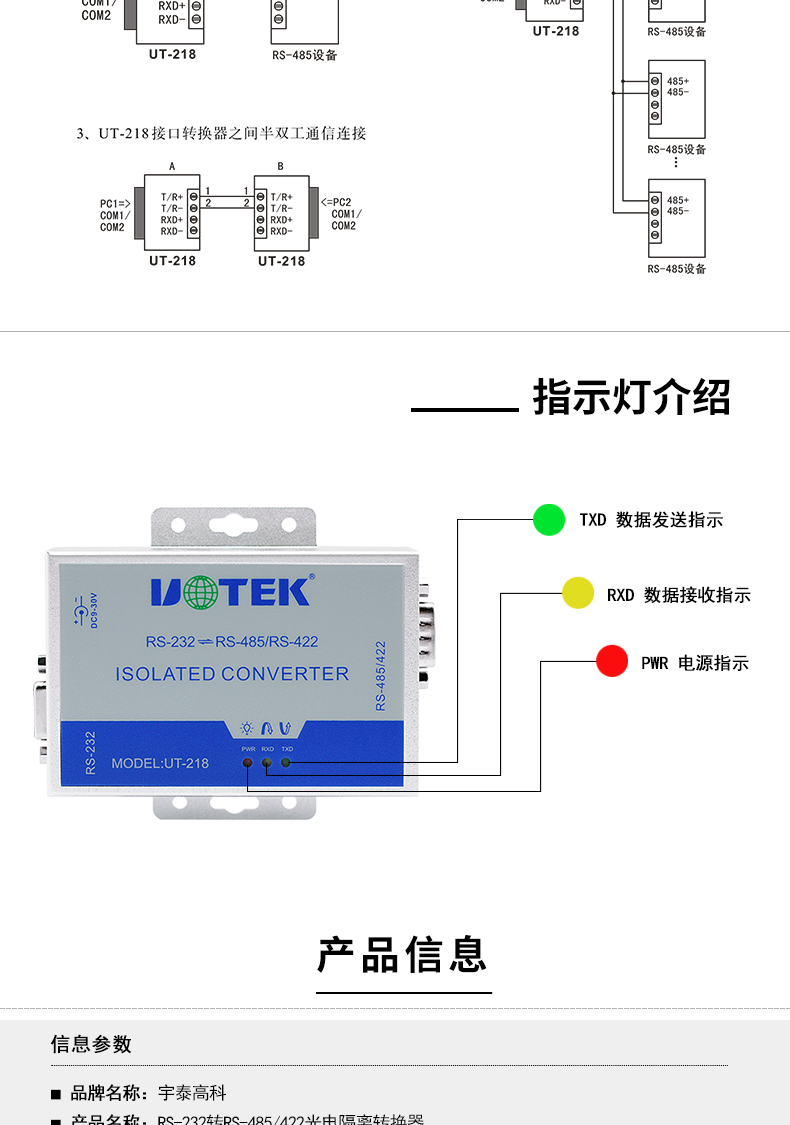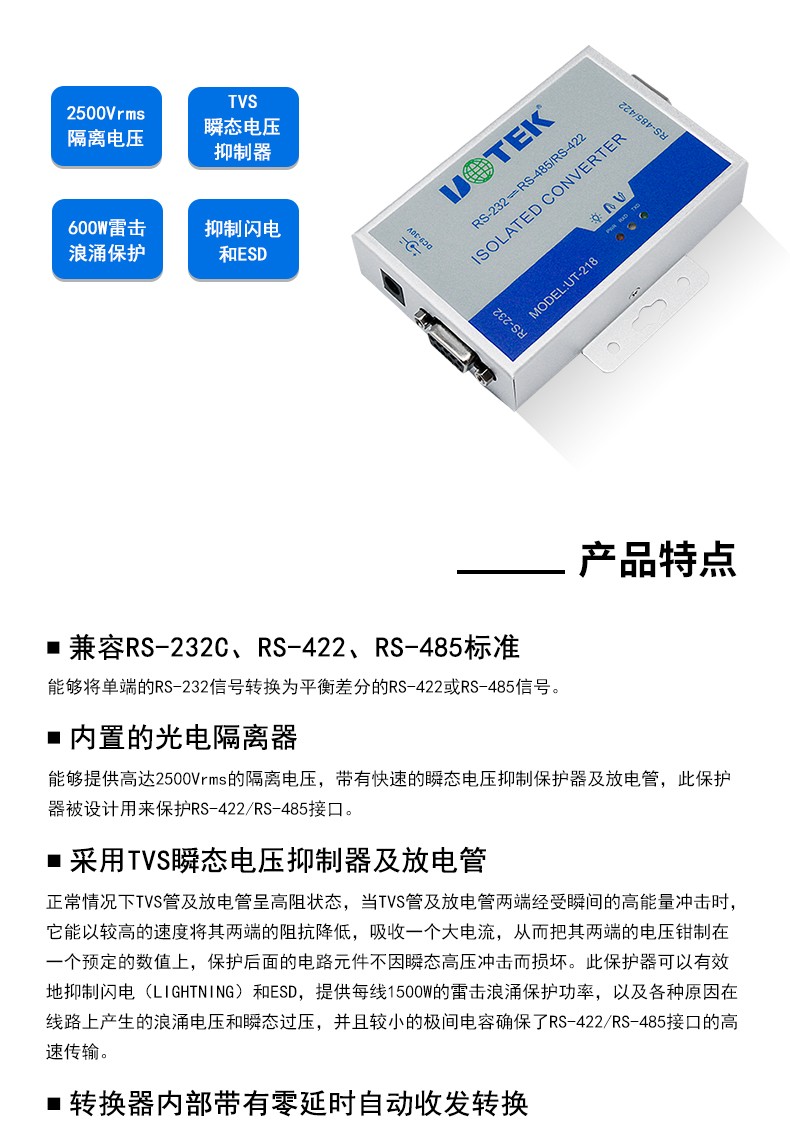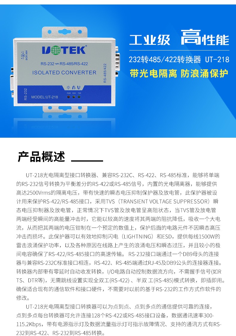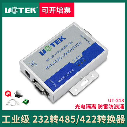 商品名称:宇泰UT-218 工业级光电隔离加强防雷型RS232转RS485/422转换器232转422转换器有源通讯模块