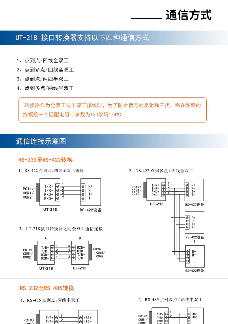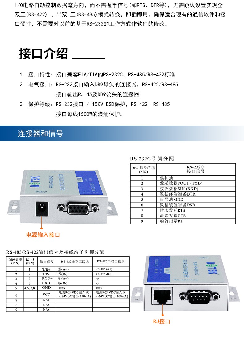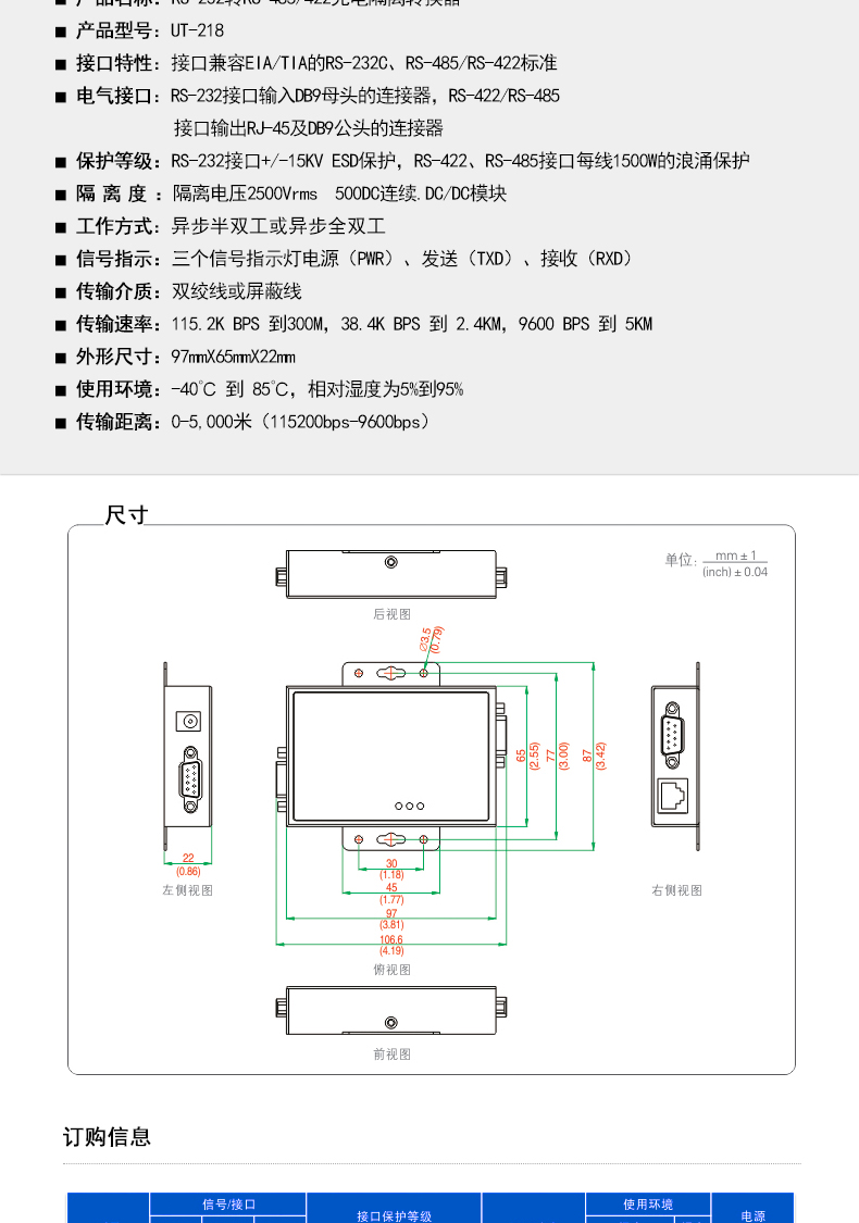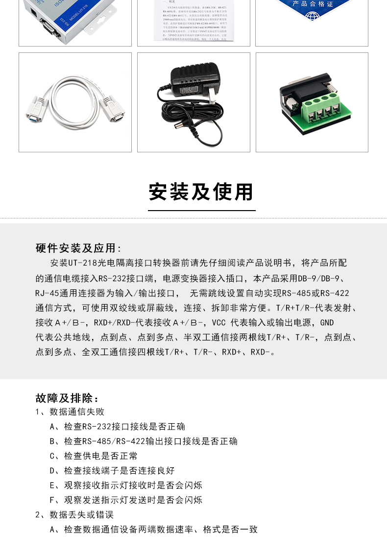 商品名称:宇泰UT-218 工业级光电隔离加强防雷型RS232转RS485/422转换器232转422转换器有源通讯模块