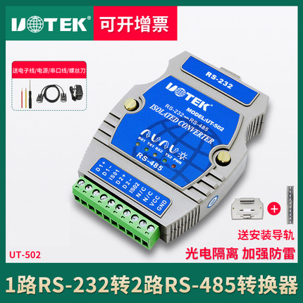 商品名称:宇泰UT-502 RS232转2路485转换器光电隔离工业级RS232转RS485模块 r232转r485串口232转485双向转换通讯
