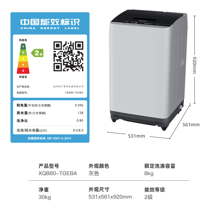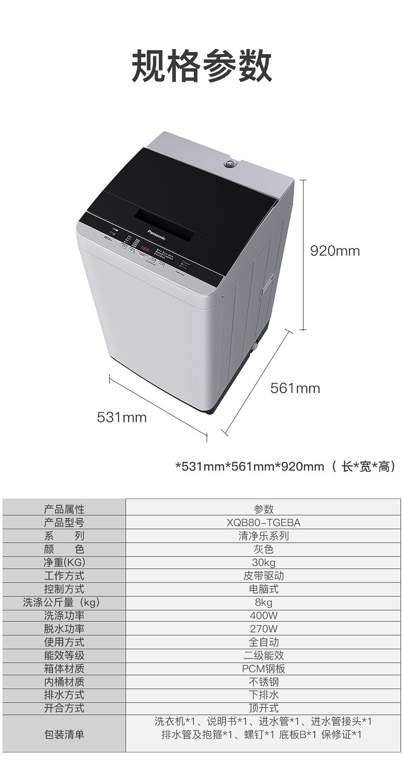 商品名称:Panasonic/松下8kg小型全自动直筒波轮洗衣机旗舰同款TGEBA涡轮式