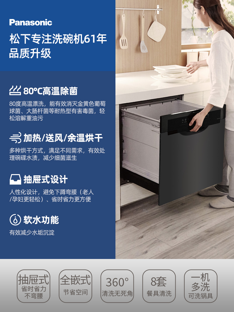 松下NP-60F1MKA全自动家用8套抽屉嵌入式高温洗涤除菌烘干洗碗机