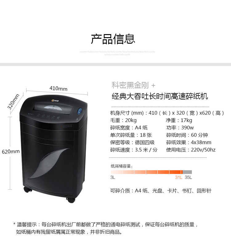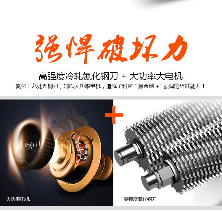 商品名称:科密黑金刚+ 60分钟18张碎卡碎光盘书钉回形针 商用大功率大量碎纸 电动家用工业A4废纸粉碎机办公碎纸机