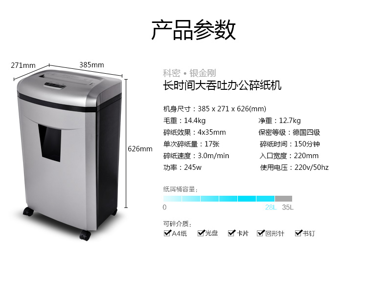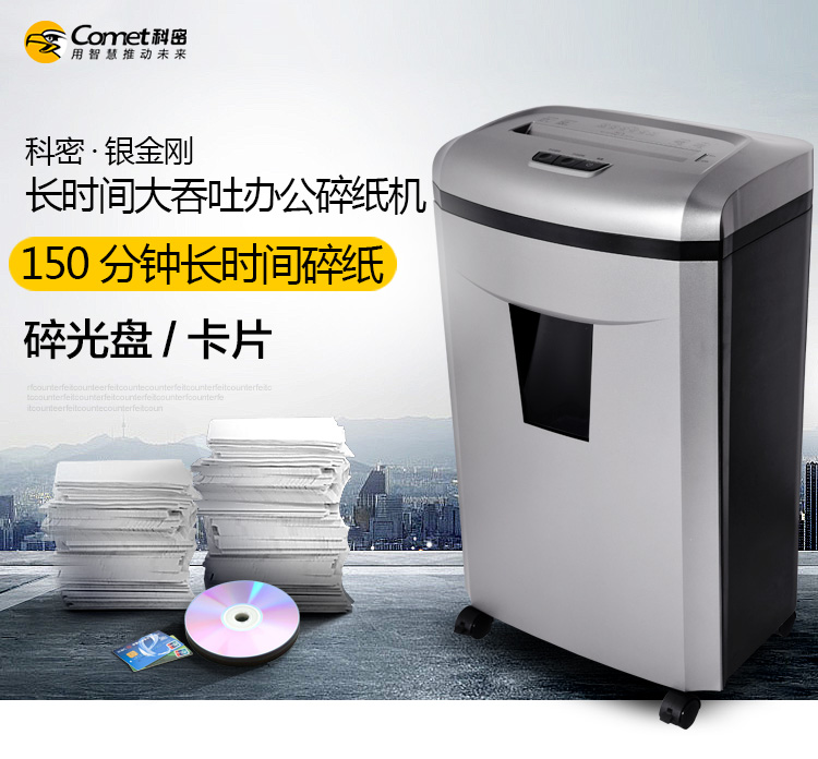 商品名称:科密(comet)大功率碎纸机 银金刚大型长时间办公碎纸大容量碎光盘碎信用卡连续碎纸150分钟 商务文件粉碎机