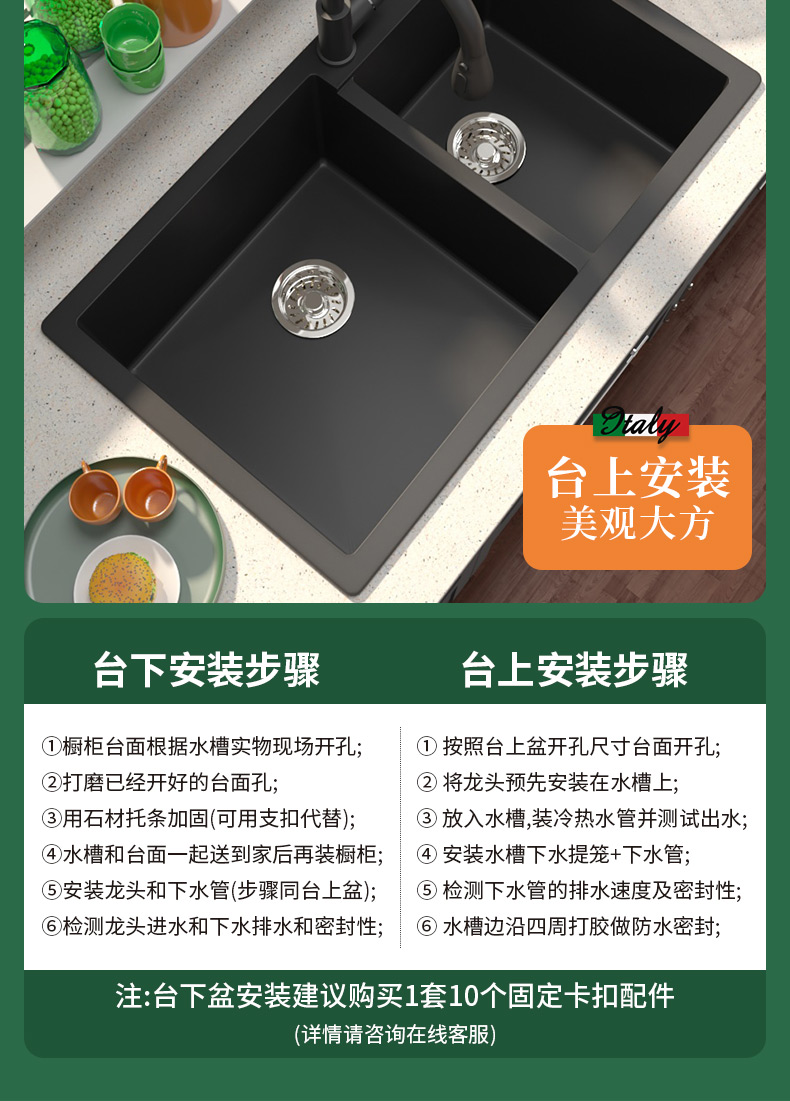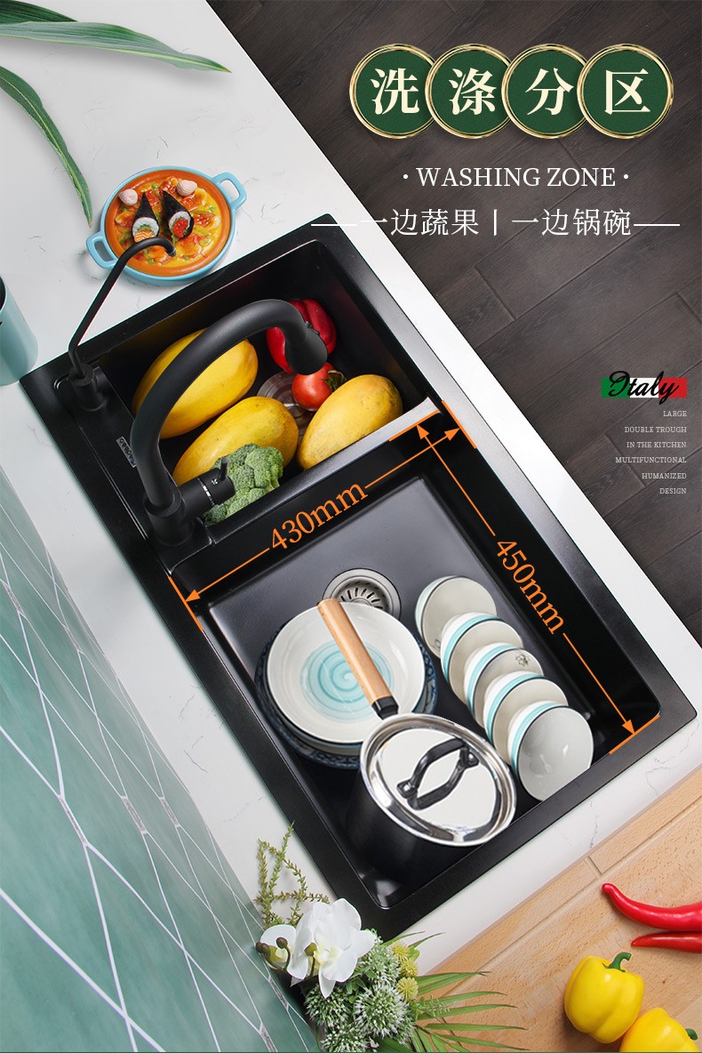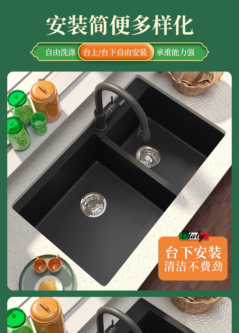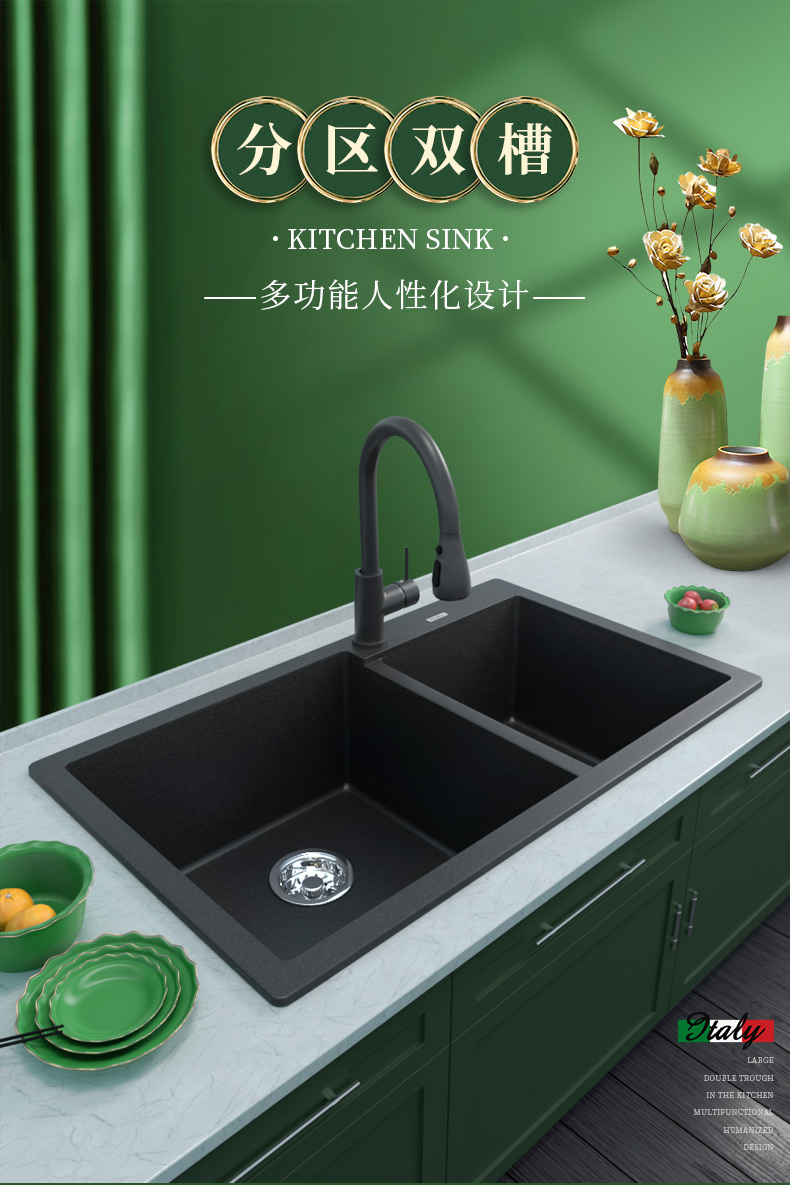 意狄讴黑色厨房石英石花岗岩水槽洗菜池洗碗槽水池大双槽台下盆
