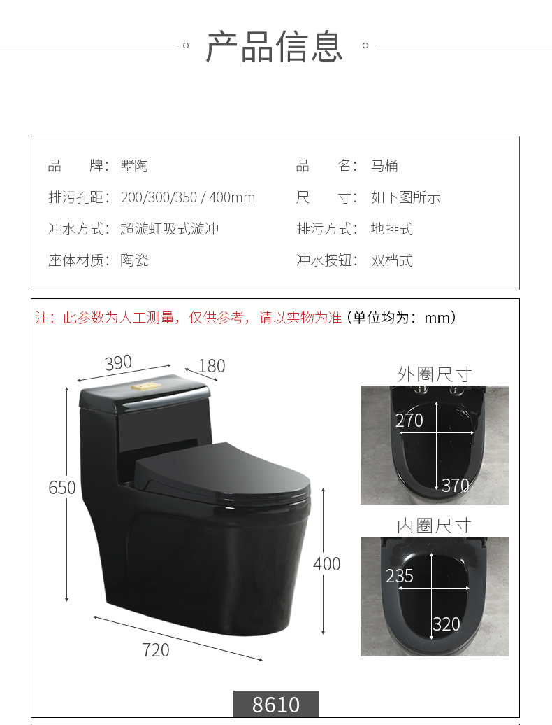 商品名称:墅陶卫浴黑色马桶家用卫生间北欧个性陶瓷坐便器