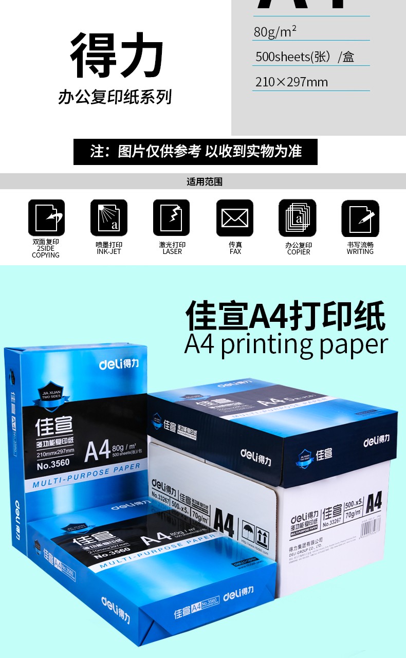 得力a4纸佳宣铭锐a4打印纸办公用白纸草稿纸70克80g a4复印纸批发