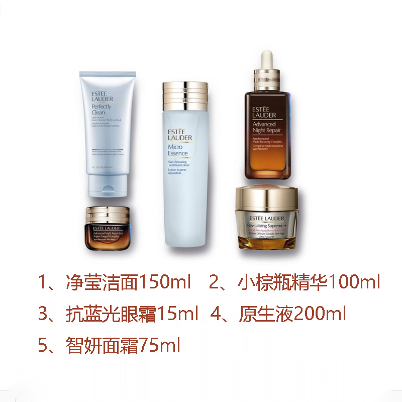 商品名称:美国Estee Lauder雅诗兰黛智妍多效抗老护肤套装五件套(净莹洁面150ml+抗蓝光眼霜15ml+智妍面霜(清爽)75ml+小棕瓶精华100ml+原生液200ml)增量版