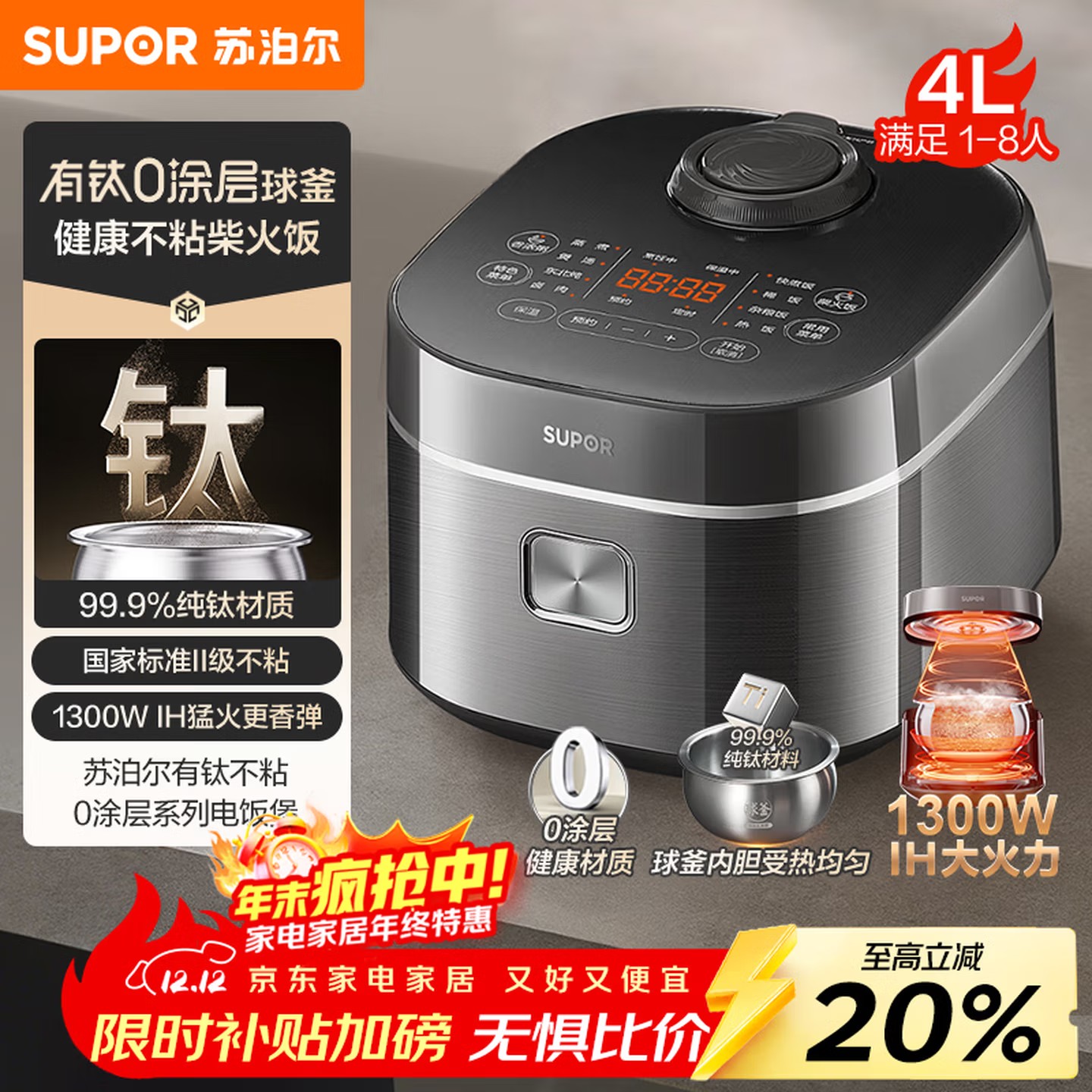 苏泊尔(SUPOR)电饭煲1-8人有钛0涂层不粘球釜4升IH加热电饭锅智能家用多功能微压煮饭锅F40H2063S