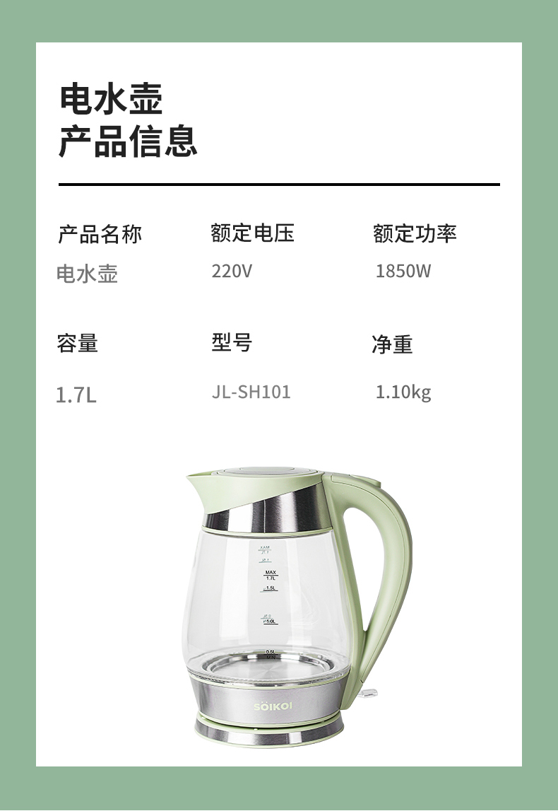 商品名称:日本SOIKOI 玻璃电热水壶 JL-SH101